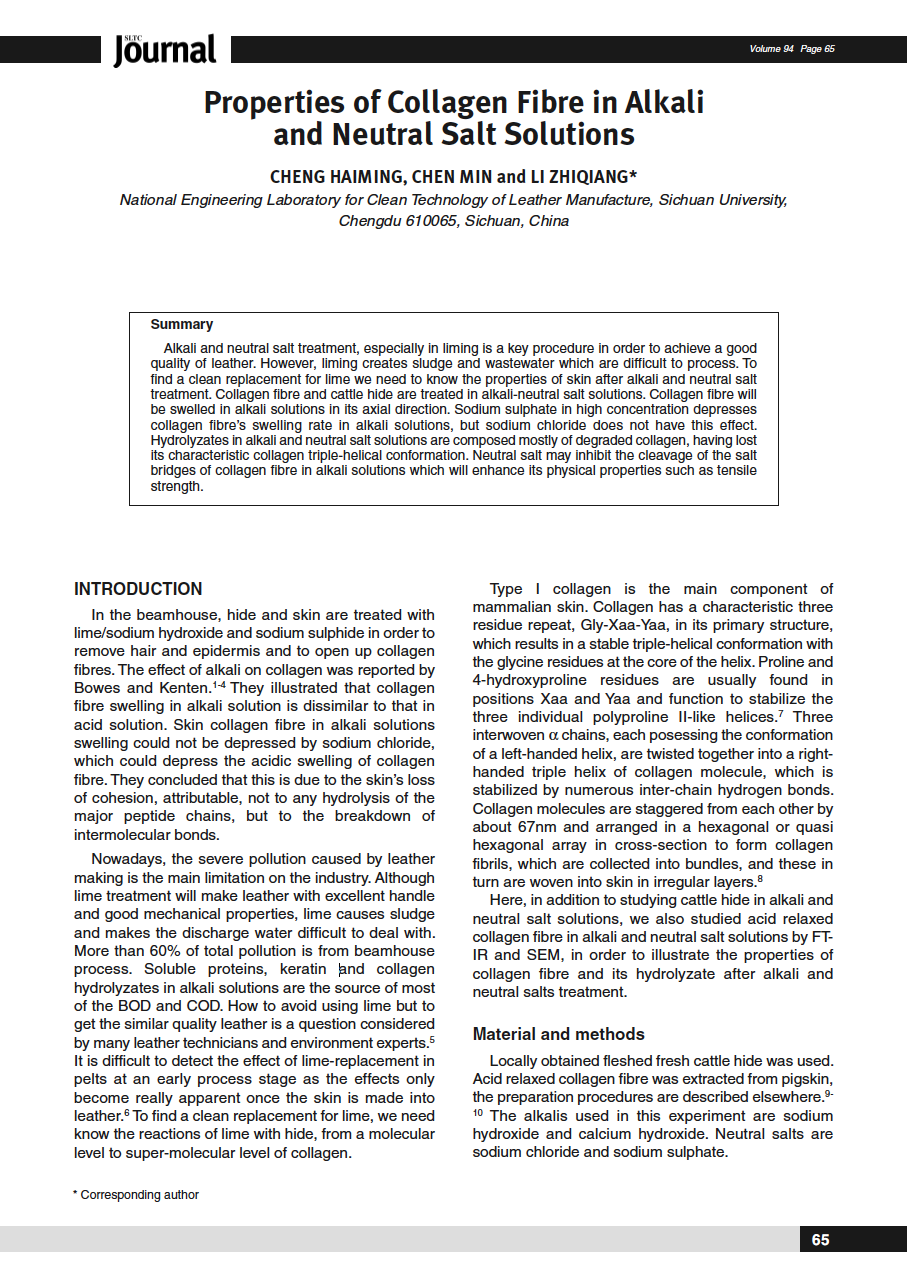 Alkali and neutral salt treatment, especially in liming is a key procedure in order to achieve a good quality of leather. However, liming creates sludge and wastewater which are difficult to process. To find a clean replacement for lime we need to know the properties of skin after alkali and neutral salt treatment. Collagen fibre and cattle hide are treated in alkali-neutral salt solutions. Collagen fibre will be swelled in alkali solutions in its axial direction. Sodium sulphate in high concentration depresses collagen fibre’s swelling rate in alkali solutions, but sodium chloride does not have this effect. Hydrolyzates in alkali and neutral salt solutions are composed mostly of degraded collagen, having lost its characteristic collagen triple-helical conformation. Neutral salt may inhibit the cleavage of the salt bridges of collagen fibre in alkali solutions which will enhance its physical properties such as tensile strength.