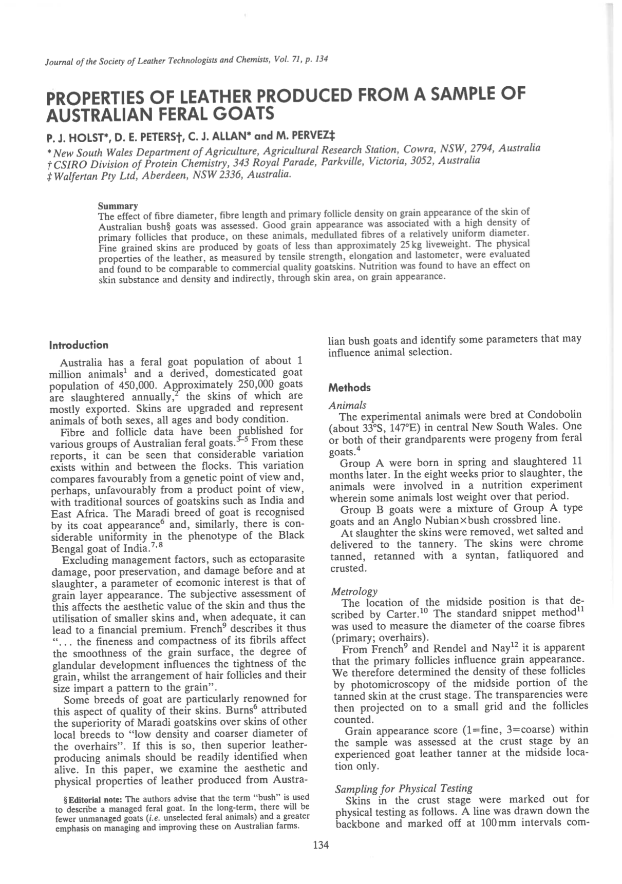 The effect of fibre diameter, fibre length and primary follicle density on grain appearance of the skin of Australian bush goats was assessed. Good grain appearance was associated with a high density of primary follicles that produce, on these animals, medullated fibres of a relatively uniform diameter. Fine grained skins are produced by goats of less than approximately 25 kg liveweight. The physical properties of the leather, as measured by tensile strength, elongation and lastometer, were evaluated and found to be comparable to commercial quality goatskins. Nutrition was found to have an effect on skin substance and density and indirectly, through skin area, on grain appearance.