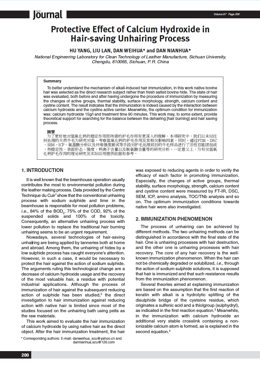 To better understand the mechanism of alkali-induced hair immunization, in this work native bovine hair was selected as the direct research subject rather than fresh salted bovine hide. The state of hair was evaluated, both before and after having undergone the procedure of immunization by measuring the changes of active groups, thermal stability, surface morphology, strength, calcium content and cystine content. The result indicates that the immunization is indeed caused by the interaction between calcium hydroxide and the cystine active center. Meanwhile, the optimum condition for immunization was: calcium hydroxide 15g/l and treatment time 90 minutes. This work may, to some extent, provide theoretical support for searching for the balance between the dehairing [hair burning] and hair saving process.