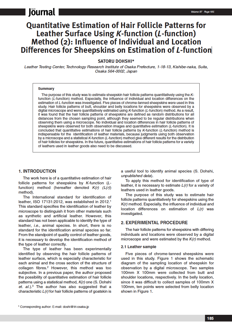 The purpose of this study was to estimate sheepskin hair follicle patterns quantitatively using the Kfunction (L-function) method. Especially, the influence of individual and location differences on the estimation of L-function was investigated. Five pieces of chrome-tanned sheepskins were used in this study. Hair follicle patterns of butt, shoulder and belly locations for sheepskins were observed by a digital microscope and were quantitatively estimated using K-function (L-function) method. As a result, it was found that the hair follicle patterns of sheepskins are defined as random distributions for all distances from the chosen sampling point, although they seemed to be regular distributions when observing them using a microscope. No individual and location differences in hair follicle patterns of sheepskins were observed for both observation images and quantitative estimation (L-function). It is concluded that quantitative estimations of hair follicle patterns by K-function (L-function) method is indispensable for the identification of leather materials, because judgments using both observation by a microscope and a statistical K-function (L-function) method give different results for the distribution of hair follicles for sheepskins. In the future, quantitative estimations of hair follicle patterns for a variety of leathers used in leather goods also need to be discussed.