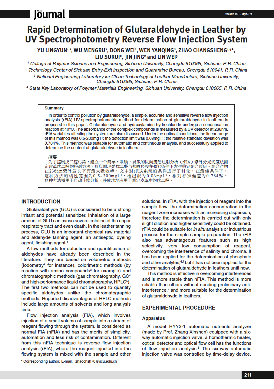 Rapid Determination of Glutaraldehyde in Leather by UV Spectrophotometry Reverse Flow Injection System