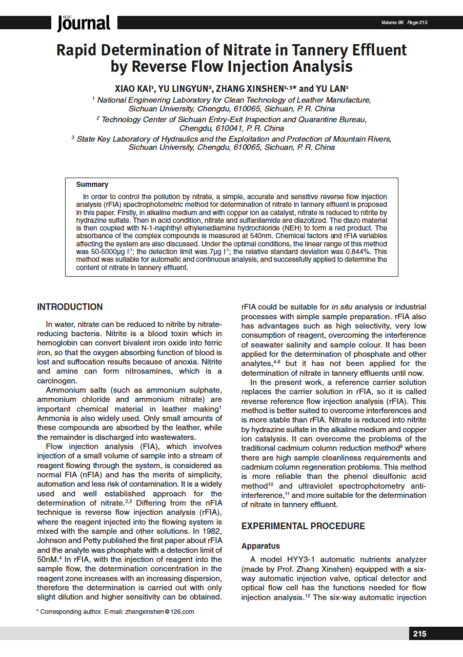 In order to control the pollution by nitrate, a simple, accurate and sensitive reverse flow injection analysis (rFIA) spectrophotometric method for determination of nitrate in tannery effluent is proposed in this paper. Firstly, in alkaline medium and with copper ion as catalyst, nitrate is reduced to nitrite by hydrazine sulfate. Then in acid condition, nitrate and sulfanilamide are diazotized. The diazo material is then coupled with N-1-naphthyl ethylenediamine hydrochloride (NEH) to form a red product. The absorbance of the complex compounds is measured at 540nm. Chemical factors and rFIA variables affecting the system are also discussed. Under the optimal conditions, the linear range of this method was 50-5000μg l-1; the detection limit was 7μg l-1; the relative standard deviation was 0.844%. This method was suitable for automatic and continuous analysis, and successfully applied to determine the content of nitrate in tannery effluent.