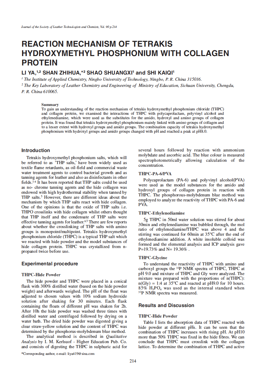 To gain an understanding of the reaction mechanism of tetrakis hydroxymethyl phosphonium chloride (THPC) and collagen protein, we examined the interactions of THPC with polycaprolactam, polyvinyl alcohol and ethylenediamine, which were used as the substitutes for the amido, hydroxyl and amino groups of collagen protein. It was found that tetrakis hydroxymethyl phosphonium mainly linked with amino groups of collagen and to a lesser extent with hydroxyl groups and amido groups. The combination capacity of tetrakis hydroxymethyl phosphonium with hydroxyl groups and amido groups changed with pH and reached a peak at pH8.0.