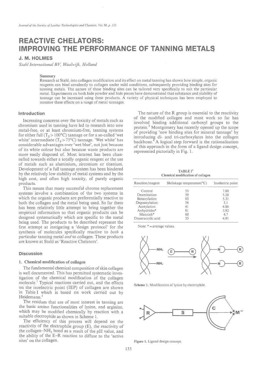 Research at Stahl, into collagen modification and its effect on metal tanning has shown how simple, organic reagents can bind covalently to collagen under mild conditions, subsequently providing binding sites for tanning metals. The nature of these binding sites can be tailored very specifically to suit the particular metal. Experiments on both hide powder and hide pieces have demonstrated that substance and stability of tannage can be increased using these products. A variety of physical techniques has been employed to monitor these effects on a range of metal tannages.
