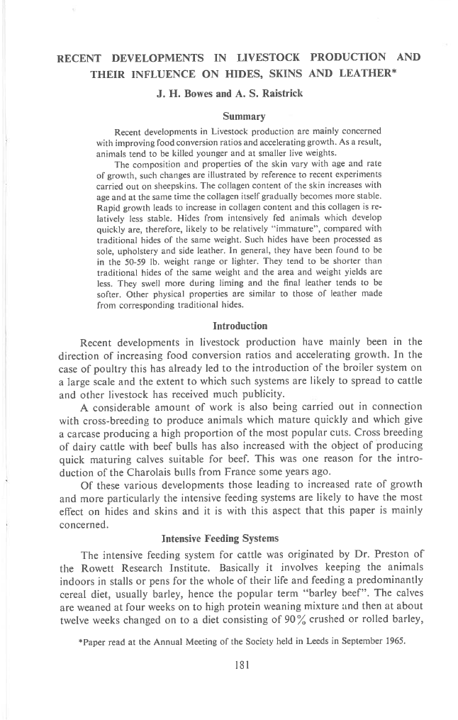 The composition and properties of the skin vary with age and rate of growth, such changes are illustrated by reference to recent experiments carried out on sheepskins. The collagen content of the skin increases with age and at the same time the collagen itself gradually becomes more stable. Rapid growth leads to increase in collagen content and this collagen is re ]atively less stable. Hides from intensively fed animals which develop quickly are, therefore, likely to be relatively “immature”, compared with traditional hides of the same weight. Such hides have been processed as sole, upholstery and side leather. In general, they have been found to be in the 50-59 lb. weight range or lighter. They tend to be shorter than traditional hides of the same weight and the area and weight yields are less. They swell more during liming and the final leather tends to be softer. Other physical properties are similar to those of leather made from corresponding traditional hides.