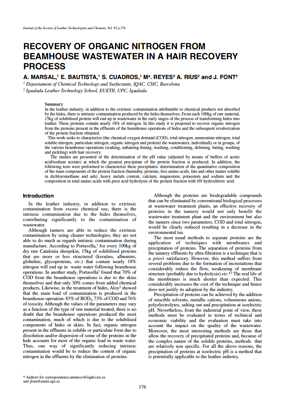 In the leather industry, in addition to the extrinsic contamination attributable to chemical products not absorbed by the hides, there is intrinsic contamination produced by the hides themselves. From each 100kg of raw material, 15kg of solubilised protein will end up in wastewater in the early stages of the process of transforming hides into leather. These proteins contain nearly 18% of nitrogen. In this study it is proposed to recover organic nitrogen from the proteins present in the effluents of the beamhouse operations of hides and the subsequent revalorization of the protein fraction obtained.