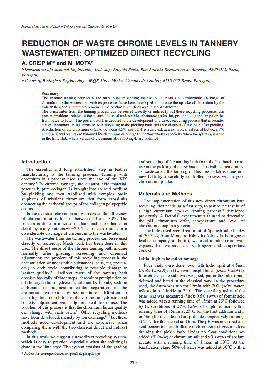 The chrome tanning process is the most popular tanning method but it results a considerable discharge of chromium to the wastewater. Various processes have been developed to increase the up-take of chromium by the hide with success, but there remains a major chromium discharge to the wastewater. The wastewater from the tanning process can be reused directly or indirectly but these recycling processes can present problems related to the accumulation of undesirable substances (salts, fat, protein, etc.) and irregularities from batch to batch. The present work is devoted to the development of a direct recycling process that associates a high chromium up-take process with recycling to the pickling bath and then disposal of this bath after pickling. A reduction of the chromium offer to between 4.5% and 5.5% is achieved, against typical values of between 7% and 8%. Good results are obtained for chromium discharge to the wastewater especially when the splitting is done in the lime state where values of chromium about 50 mg/L are obtained.