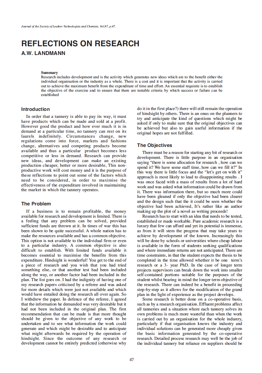 Research includes development and is the activity which generates new ideas which are to the benefit either the individual organisation or the industry as a whole. There is a cost and it is important that the activity is carried out to achieve the maximum benefit from the expenditure of time and effort. An essential requisite is to establish the objective of the exercise and to ensure that there are testable criteria by which success or failure can be established.