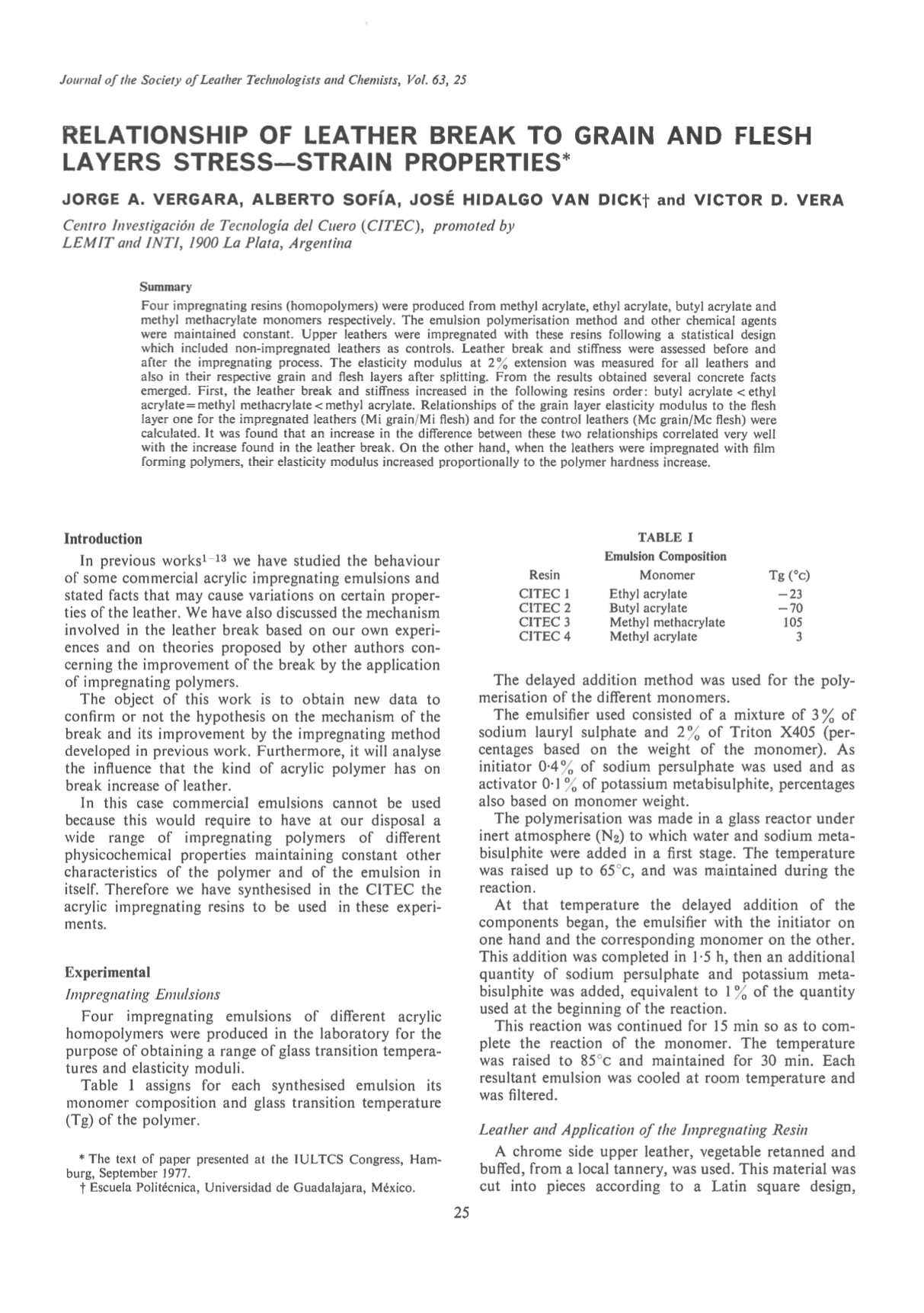 Four impregnating resins (homopolymers) were produced from methyl acrylate, ethyl acrylate, butyl acrylate and methyl methacrylate monomers respectively. The emulsion polymerisation method and other chemical agents were maintained constant. Upper leathers were impregnated with these resins following a statistical design which included non-impregnated leathers as controls. Leather break and stiffness were assessed before and after the impregnating process. The elasticity modulus at 2% extension was measured for all leathers and also in their respective grain and flesh layers after splitting. From the results obtained several concrete facts emerged. First, the leather break and stiffness increased in the following resins order: butyl acrylate < ethyl acrylate = methyl methacrylate < methyl acrylate. Relationships of the grain layer elasticity modulus to the flesh layer one for the impregnated leathers (Mi grain/Mi flesh) and for the control leathers (Mc grain/Mc flesh) were calculated. It was found that an increase in the difference between these two relationships correlated very well with the increase found in the leather break. On the other hand, when the leathers were impregnated with film forming polymers, their elasticity modulus increased proportionally to the polymer hardness increase.
