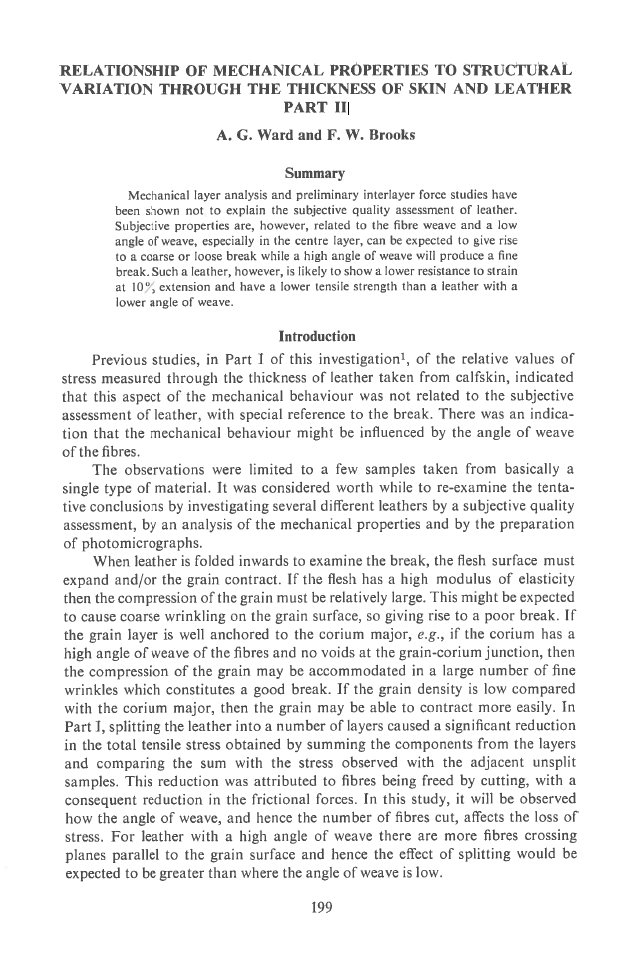 Mechanical layer analysis and preliminary interlayer force studies have been shown not to explain the subjective quality assessment of leather. Subjective properties are, however, related to the fibre weave and a low angle of weave, especially in the centre layer, can be expected to give rise to a coarse or loose break while a high angle of weave will produce a fine break. Such a leather, however, is likely to show a lower resistance to strain at lO% extension and have a lower tensile strength than a leather with a lower angle of weave.