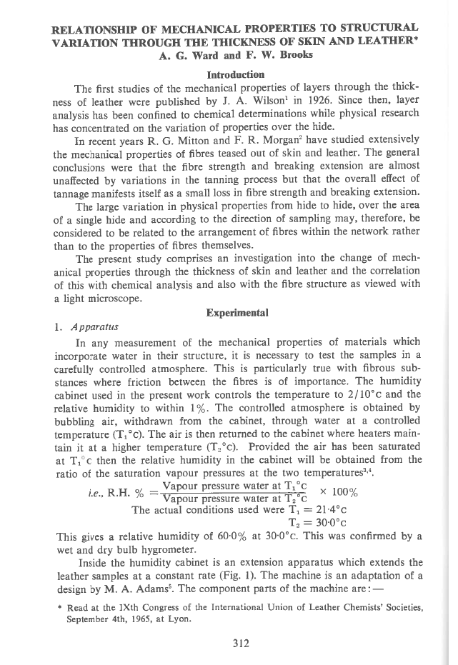 The first studies of the mechanical properties of layers through the thick ness of leather were published by J. A. Wilson’ in 1926. Since then, layer analysis has been confined to chemical determinations while physical research has concentrated on the variation of properties over the hide. In recent years R. G. Mitton and F. R. Morgan2have studied extensively the mechanical properties of fibres teased out of skin and leather. The general conclusions were that the fibre strength and breaking extension are almost unaffected by variations in the tanning process but that the overall effect of tannage manifests itself as a small loss in fibre strength and breaking extension. The large variation in physical properties from hide to hide, over the area of a single hide and according to the direction of sampling may, therefore, be considered to be related to the arrangement of fibres within the network rather than to the properties of fibres themselves. The present study comprises an investigation into the change of mech anical properties through the thickness of skin and leather and the correlation of this with chemical analysis and also with the fibre structure as viewed with a light microscope.