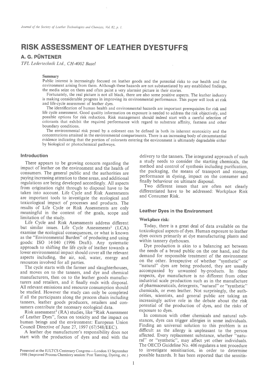 Fortunately, the real picture is not all black, there are also some positive aspects. The leather industry is making considerable progress in improving its environmental performance. This paper will look at risk and life-cycle assessment of leather dyes.