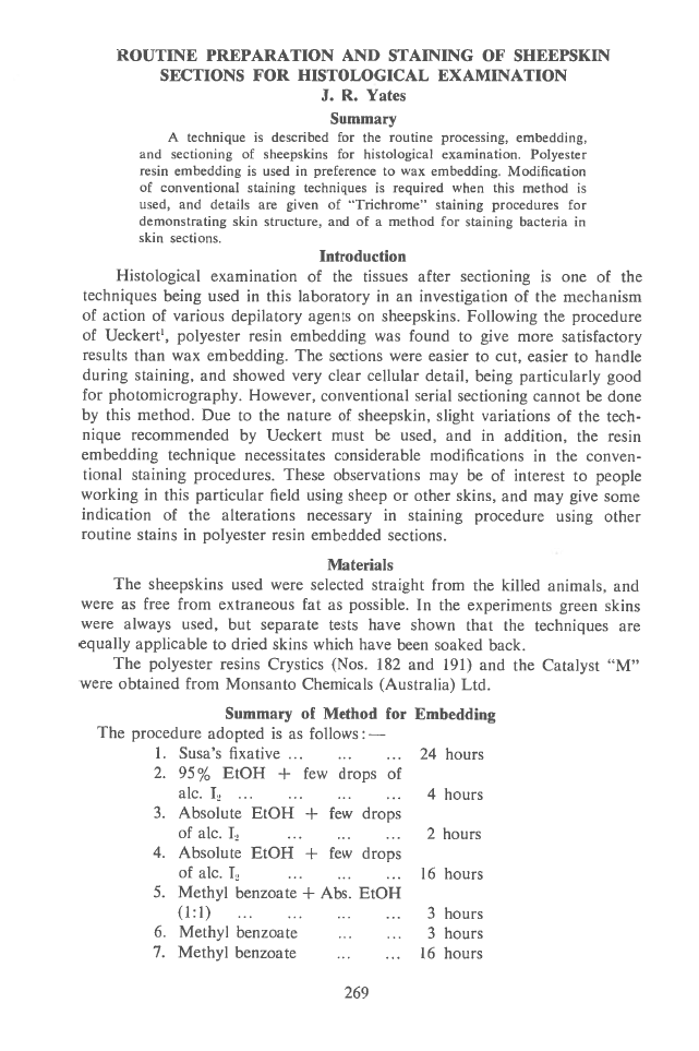 A technique is described for the routine processing, embedding, and sectioning of sheepskins for histological examination. Polyester resin embedding is used in preference to wax embedding. Modification of conventional staining techniques is required when this method is used, and details are given of “Trichrome” staining procedures for demonstrating skin structure, and of a method for staining bacteria in skin sections.