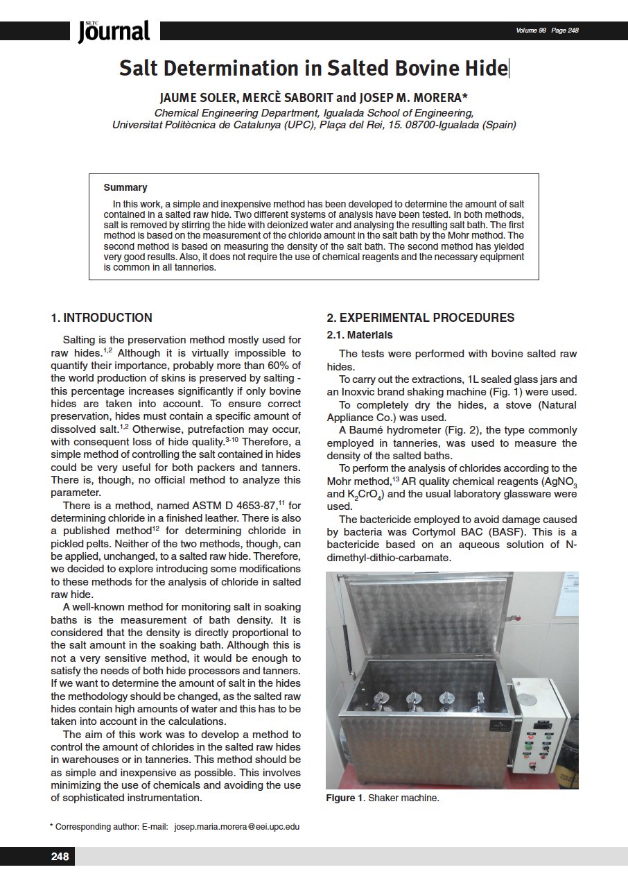 In this work, a simple and inexpensive method has been developed to determine the amount of salt contained in a salted raw hide. Two different systems of analysis have been tested. In both methods, salt is removed by stirring the hide with deionized water and analysing the resulting salt bath. The first method is based on the measurement of the chloride amount in the salt bath by the Mohr method. The second method is based on measuring the density of the salt bath. The second method has yielded very good results. Also, it does not require the use of chemical reagents and the necessary equipment is common in all tanneries.