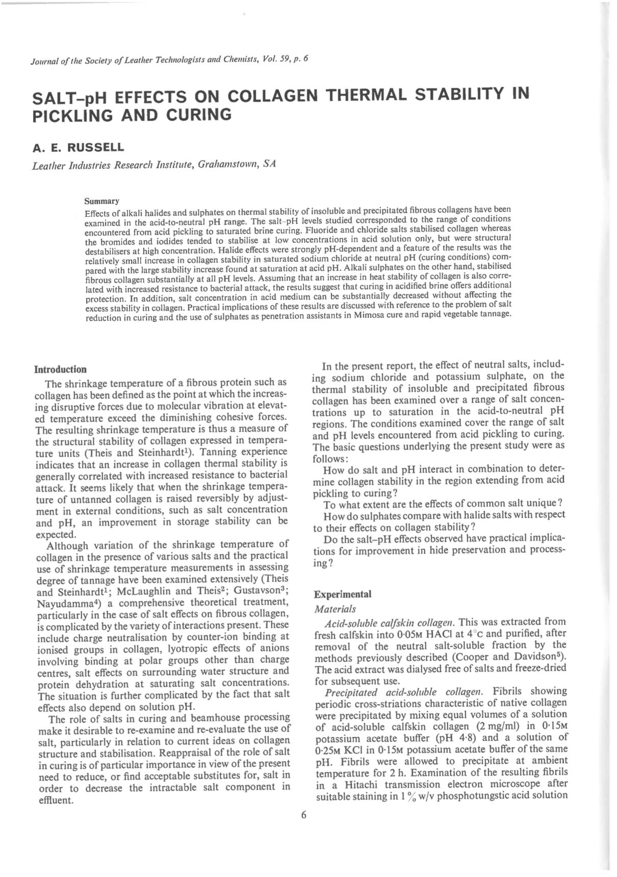 Effects of alkali halides and sulphates on thermal stability of insoluble and precipitated fibrous collagens have been examined in the acid-to-neutral pH range. The salt-pH levels studied corresponded to the range of conditions encountered from acid pickling to saturated brine curing. Fluoride and chloride salts stabilised collagen whereas the bromides and iodides tended to stabilise at low concentrations in acid solution only, but were structural destabilisers at high concentration. Halide effects were strongly pH-dependent and a feature of the results was the relatively small increase in collagen stability in saturated sodium chloride at neutral pH (curing conditions) compared with the large stability increase found at saturation at acid pH. Alkali sulphates on the other hand, stabilised fibrous collagen substantially at all pH levels. Assuming that an increase in heat stability of collagen is also correlated with increased resistance to bacterial attack, the results suggest that curing in acidified brine offers additional protection. In addition, salt concentration in acid medium can be substantially decreased without affecting the excess stability in collagen. Practical implications of these results are discussed with reference to the problem of salt reduction in curing and the use of sulphates as penetration assistants in Mimosa cure and rapid vegetable tannage.