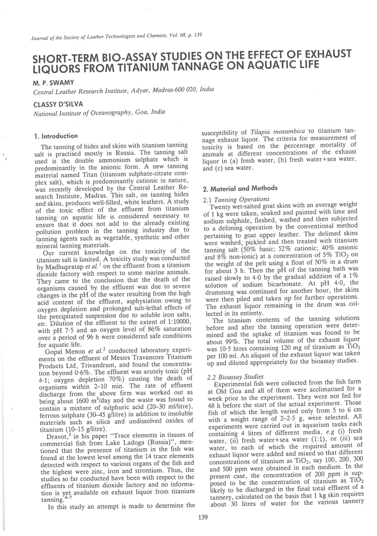 Short-Term Bio-Assay Studies on the Effect of Exhaust Liquors from Titanium Tannage on Aquatic Life