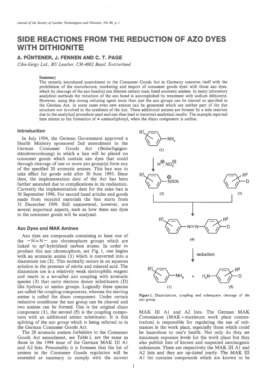 The recently introduced amendment to the Consumer Goods Act in Germany concerns itself with the prohibition of the manufacture, marketing and import of consumer goods dyed with those azo dyes, which by cleavage of the azo bond(s) can liberate certain toxic listed aromatic amines. In many laboratory analytical methods the reduction of the azo bond is accomplished by treatment with sodium dithionite. However, using this strong reducing agent more than just the azo groups can be cleaved as specified in the German Act. In some cases even new amines can be generated which are neither part of the dye structure nor involved in the synthesis of the dye. These additional amines are formed by a side reaction due to the analytical procedure used and can thus lead to incorrect analytical results. The example reported here relates to the formation of 4—aminodiphenyl, when the diazo component is aniline.