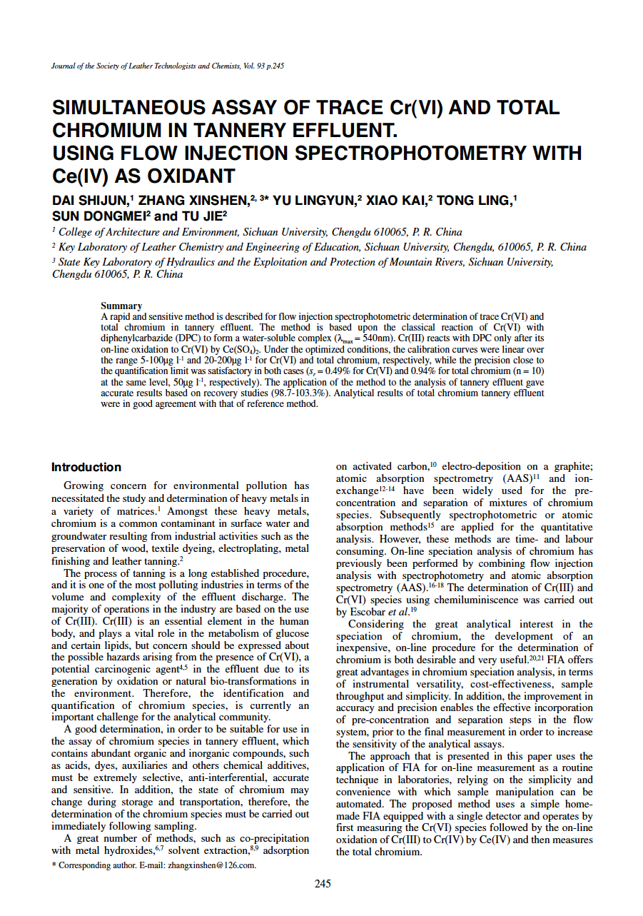 A rapid and sensitive method is described for flow injection spectrophotometric determination of trace Cr(VI) and total chromium in tannery effluent. The method is based upon the classical reaction of Cr(VI) with diphenylcarbazide (DPC) to form a water-soluble complex (λmax = 540nm). Cr(III) reacts with DPC only after its on-line oxidation to Cr(VI) by Ce(SO4)2. Under the optimized conditions, the calibration curves were linear over the range 5-100μg l-1 and 20-200μg l-1 for Cr(VI) and total chromium, respectively, while the precision close to the quantification limit was satisfactory in both cases (sr = 0.49% for Cr(VI) and 0.94% for total chromium (n = 10) at the same level, 50μg l-1, respectively). The application of the method to the analysis of tannery effluent gave accurate results based on recovery studies (98.7-103.3%). Analytical results of total chromium tannery effluent were in good agreement with that of reference method.