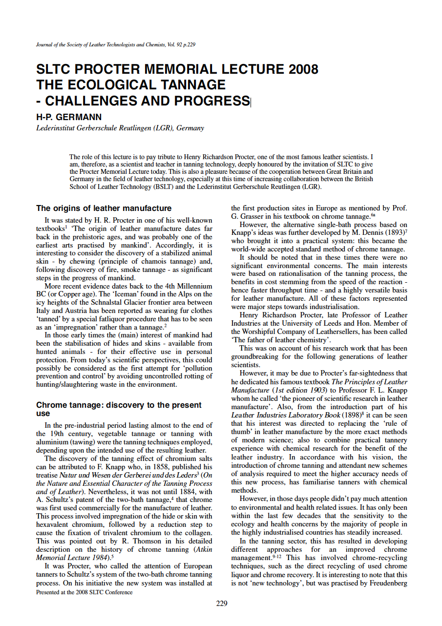 The role of this lecture is to pay tribute to Henry Richardson Procter, one of the most famous leather scientists. I am, therefore, as a scientist and teacher in tanning technology, deeply honoured by the invitation of SLTC to give the Procter Memorial Lecture today. This is also a pleasure because of the cooperation between Great Britain and Germany in the field of leather technology, especially at this time of increasing collaboration between the British School of Leather Technology (BSLT) and the Lederinstitut Gerberschule Reutlingen (LGR).
