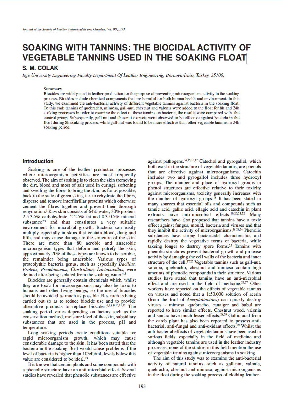 Biocides are widely used in leather production for the purpose of preventing microorganism activity in the soaking process. Biocides include chemical components that are harmful for both human health and environment. In this study, we examined the anti-bacterial activity of different vegetable tannins against bacteria in the soaking float. To this end; tannins of quebracho, mimosa, gall-nut, chestnut and valonia were added to the float for 8h and 24h soaking processes in order to examine the effect of these tannins on bacteria, the results were compared with the control group. Subsequently, gall-nut and chestnut extracts were observed to be effective against bacteria in the float during 8h soaking process, while gall-nut was found to be more effective than other vegetable tannins in 24h soaking period.