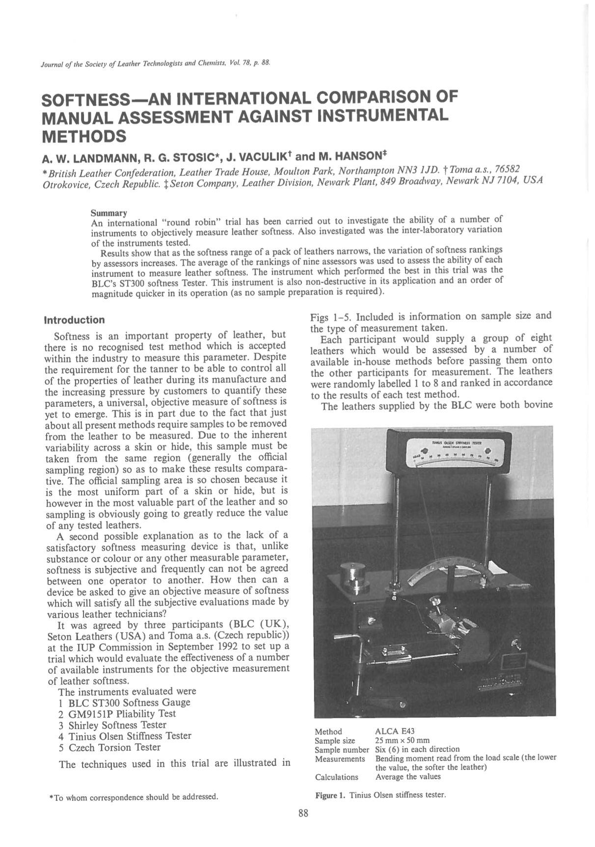An international “round robin” trial has been carried out to investigate the ability of a number of instruments to objectively measure leather softness. Also investigated was the inter-laboratory variation of the instruments tested. Results show that as the softness range of a pack of leathers narrows, the variation of softness rankings by assessors increases. The average of the rankings of nine assessors was used to assess the ability of each instrument to measure leather softness. The instrument which performed the best in this trial was the BLC’s ST300 Softness Tester. This instrument is also non-destructive in its application and an order of magnitude quicker in its operation (as no sample preparation is required).