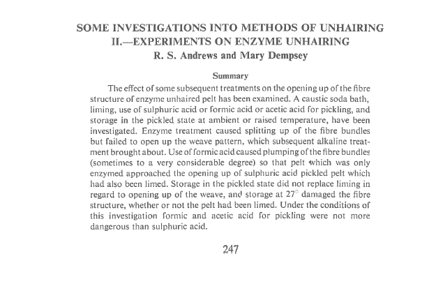 The effect of some subsequent treatments on the opening up of the fibre structure of enzyme unhaired pelt has been examined. A caustic soda bath, liming, use of sulphuric acid or formic acid or acetic acid for pickling, and storage in the pickled state at ambient or raised temperature, have been investigated. Enzyme treatment caused splitting up of the fibre bundles but failed to open up the weave pattern, which subsequent alkaline treat ment brought about. Use of formic acid caused plumping of the fibre bundles (sometimes to a very considerable degree) so that pelt which was only enzymed approached the opening up of sulphuric acid pickled pelt which had also been limed. Storage in the pickled state did not replace liming in regard to opening up of the weave, and storage at 27° damaged the fibre structure, whether or not the pelt had been limed. Under the conditions of this investigation formic and acetic acid for pickling were not more dangerous than sulphuric acid.