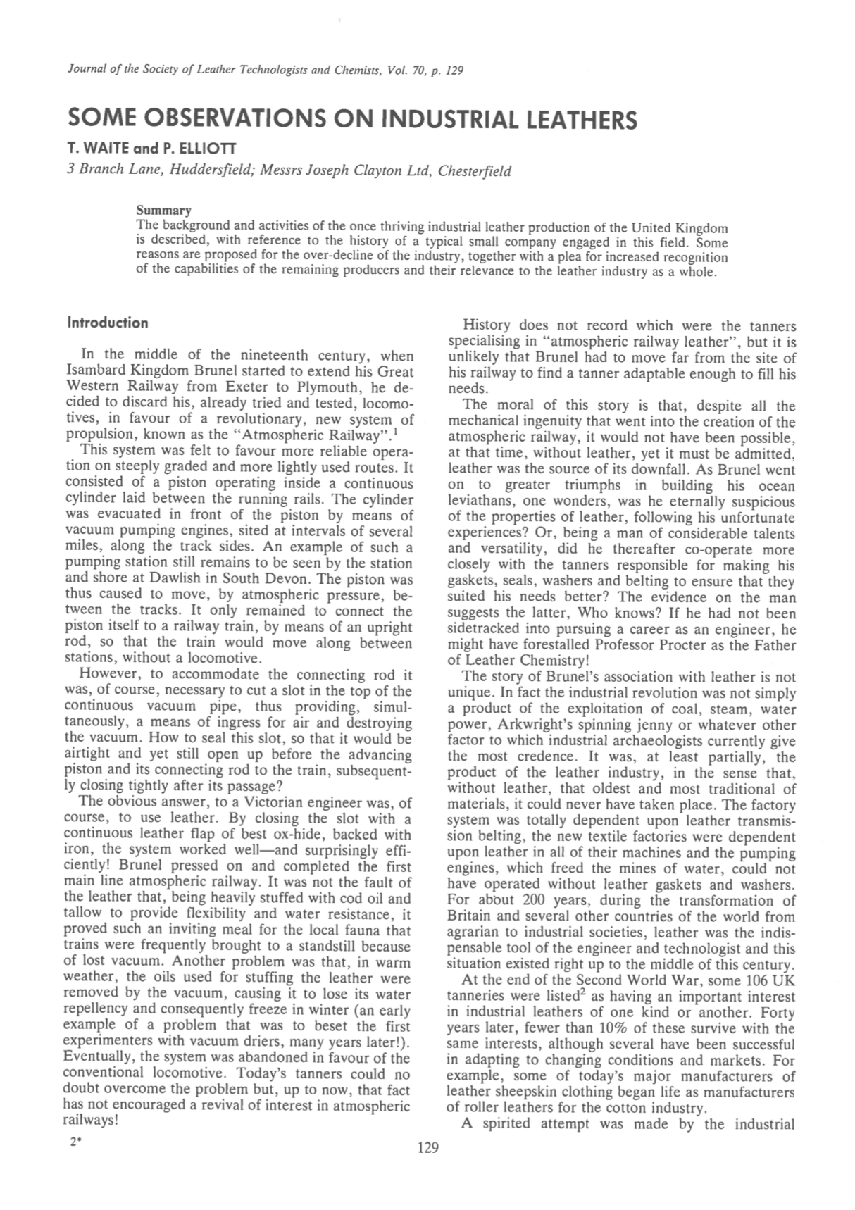 The background and activities of the once thriving industrial leather production of the United Kingdom is described, with reference to the history of a typical small company engaged in this field. Some reasons are proposed for the over-decline of the industry, together with a plea for increased recognition of the capabilities of the remaining producers and their relevance to the leather industry as a whole.