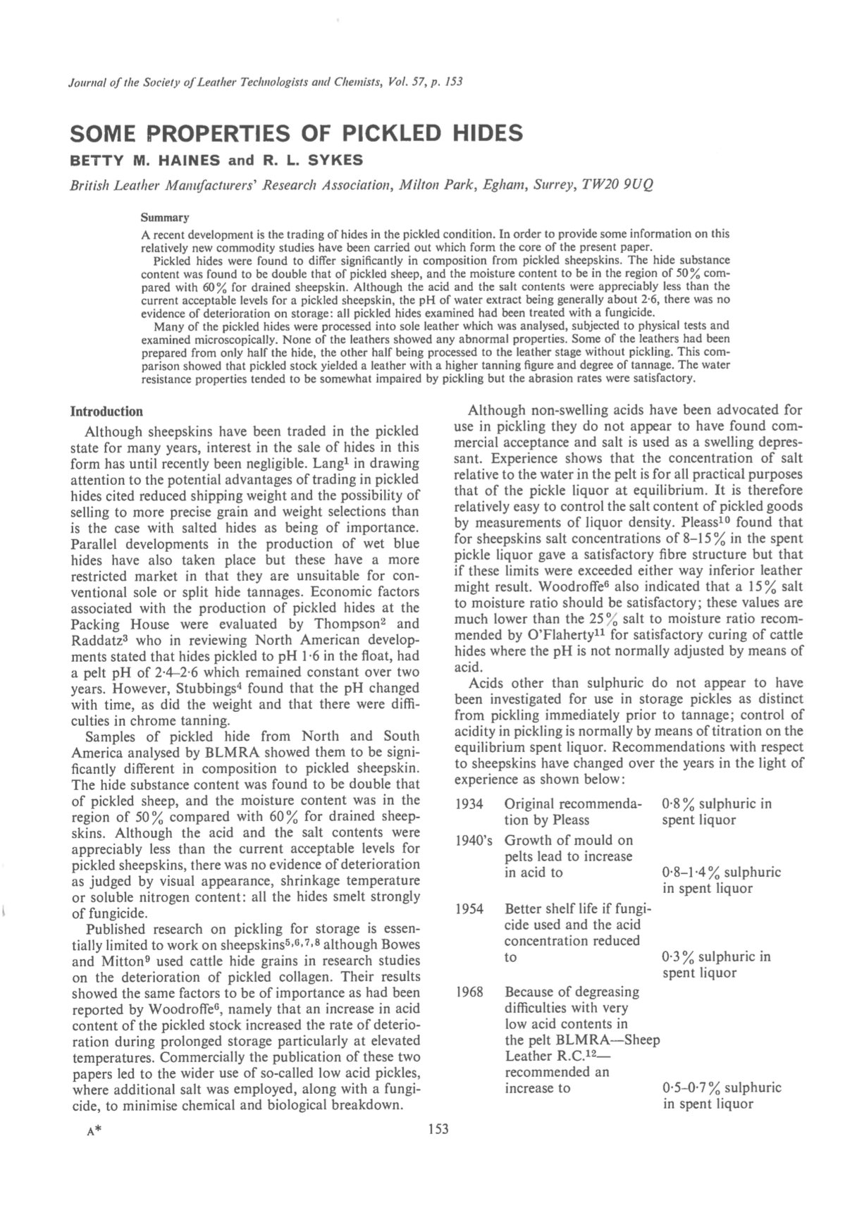 A recent development is the trading of hides in the pickled condition. In order to provide some information on this relatively new commodity studies have been carried out which form the core of the present paper. Pickled hides were found to differ significantly in composition from pickled sheepskins. The hide substance content was found to be double that of pickled sheep, and the moisture content to be in the region of 50% compared with 60% for drained sheepskin. Although the acid and the salt contents were appreciably less than the current acceptable levels for a pickled sheepskin, the pH of water extract being generally about 2.6, there was no evidence of deterioration on storage: all pickled hides examined had been treated with a fungicide. Many of the pickled hides were processed into sole leather which was analysed, subjected to physical tests and examined microscopically. None of the leathers showed any abnormal properties. Some of the leathers had been prepared from only half the hide, the other half being processed to the leather stage without pickling. This comparison showed that pickled stock yielded a leather with a higher tanning figure and degree of tannage. The water resistance properties tended to be somewhat impaired by pickling but the abrasion rates were satisfactory.