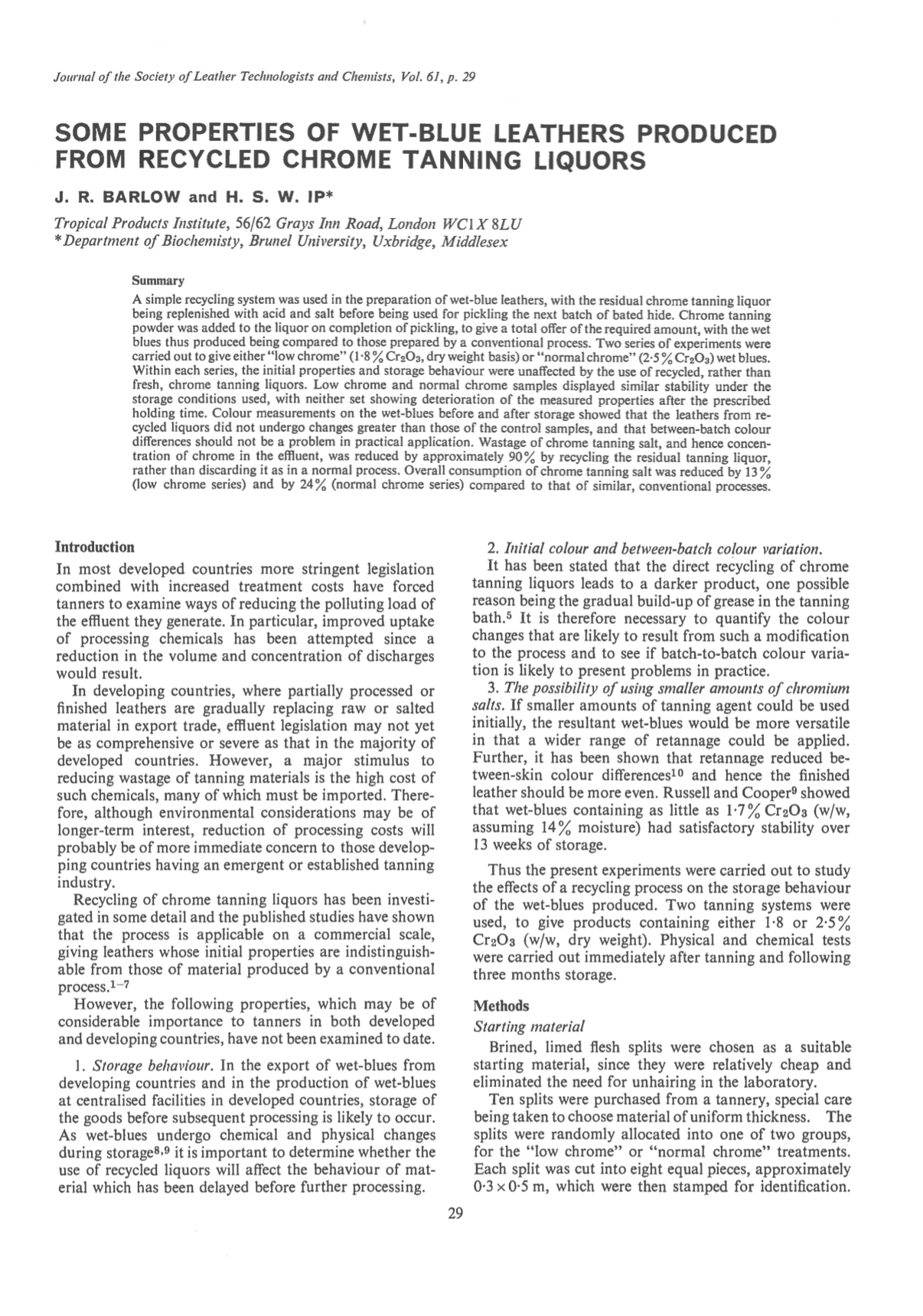 A simple recycling system was used in the preparation of wet-blue leathers, with the residual chrome tanning liquor being replenished with acid and salt before being used for pickling the next batch of bated hide. Chrome tanning powder was added to the liquor on completion of pickling, to give a total offer of the required amount, with the wet blues thus produced being compared to those prepared by a conventional process. Two series of experiments were carried out to give either “low chrome” (1.8% Cr₂O₃, dry weight basis) or “normal chrome” (2.5% Cr₂O₃) wet blues. Within each series, the initial properties and storage behaviour were unaffected by the use of recycled, rather than fresh, chrome tanning liquors. Low chrome and normal chrome samples displayed similar stability under the storage conditions used, with neither set showing deterioration of the measured properties after the prescribed holding time. Colour measurements on the wet-blues before and after storage showed that the leathers from recycled liquors did not undergo changes greater than those of the control samples, and that between-batch colour differences should not be a problem in practical application. Wastage of chrome tanning salt, and hence concentration of chrome in the effluent, was reduced by approximately 90% by recycling the residual tanning liquor, rather than discarding it as in a normal process. Overall consumption of chrome tanning salt was reduced by 13% (low chrome series) and by 24% (normal chrome series) compared to that of similar, conventional processes.