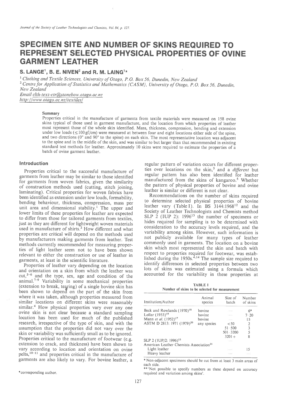 Properties critical in the manufacture of garments from textile materials were measured on 158 ovine skins typical of those used in garment manufacture, and the location from which properties of leather most represent those of the whole skin identified. Mass, thickness, compression, bending and extension under low loads (lOOgf/cm) were measured at between four and eight locations either side of the spine, and two directions (0 and 90° to the spine) on each skin. The most representative location was adjacent to the spine and in the middle of the skin, and was similar to but larger than that recommended in existing standard test methods for leather. Approximately 10 skins were required to estimate the properties of a batch of ovine garment leather.
