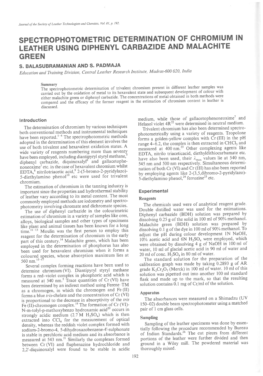 The spectrophotometric determination of trivalent chromium present in different leather samples was carried out by the oxidation of metal to its hexavalent state and subsequent development of colour with either malachite green or diphenyl carbazide. The concentrations of metal obtained in both methods were compared and the efficacy of the former reagent in the estimation of chromium content in leather is discussed.