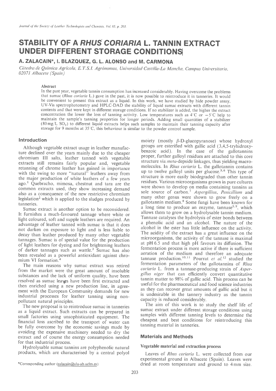 In the past year, vegetable tannin consumption has increased considerably. Having overconie the problems that sumac (Rims corearia L.) gave in the past. it is now possible to reintroduce it in tanneries. It would be convenient to present this extract as a liquid. In this work, we have studied by hide powder assay. UV-Vis spectrophotometry and HPLC-DAD the stability of liquid sumac extracts with different tannin contents and that were kept in different storage conditions. If no stabilizer is added, the higher the extract concentration the lower the loss of tanning activity. Low temperatures such as 4°C or — 5C help to maintain the sample’s tanning properties for longer periods. Adding small quantities of a stabilizer (80 mg/L SO,) to different liquid extracts helps such samples to maintain their tanning capacity after storage for 9 nionths at 35 C, this behaviour is similar to the powder control sample.