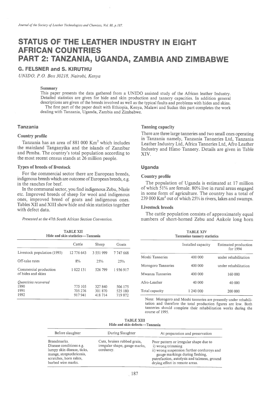 This paper presents the data gathered from a UNIDO assisted study of the African leather Industry. Detailed statistics are given for hide and skin production and tannery capacities. In addition general descriptions are given of the breeds involved as well as the typical faults and problems with hides and skins. The first part of the paper dealt with Ethiopia, Kenya, Malawi and Sudan this part completes the work dealing with Tanzania, Uganda, Zambia and Zimbabwe.