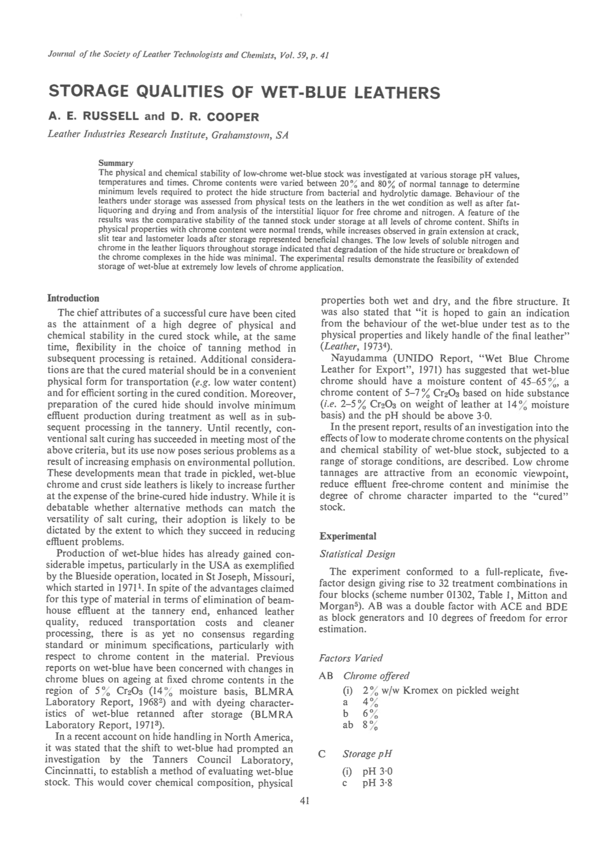 The physical and chemical stability of low-chrome wet-blue stock was investigated at various storage pH values, temperatures and times. Chrome contents were varied between 20% and 80%, of normal tannage to determine minimum levels required to protect the hide structure from bacterial and hydrolytic damage. Behaviour of the leathers under storage was assessed from physical tests on the leathers in the wet condition as well as after fatliquoring and drying and from analysis of the interstitial liquor for free chrome and nitrogen. A feature of the results was the comparative stability of the tanned stock under storage at all levels of chrome content. Shifts in physical properties with chrome content were normal trends, while increases observed in grain extension at crack, slit tear and lastometer loads after storage represented beneficial changes. The low levels of soluble nitrogen and chrome in the leather liquors throughout storage indicated that degradation of the hide structure or breakdown of the chrome complexes in the hide was minimal. The experimental results demonstrate the feasibility of extended storage of wet-blue at extremely low levels of chrome application.