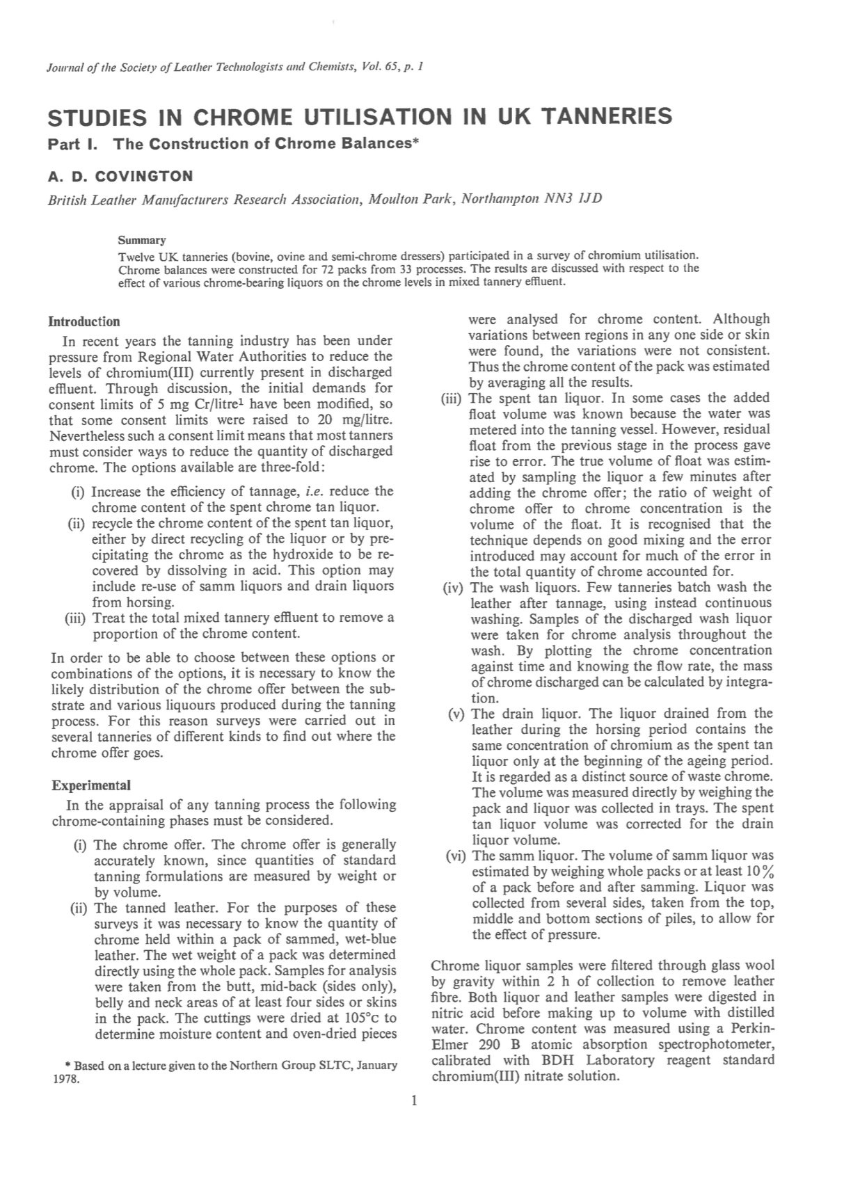 Studies in Chrome Utilisation in UK Tanneries Part I