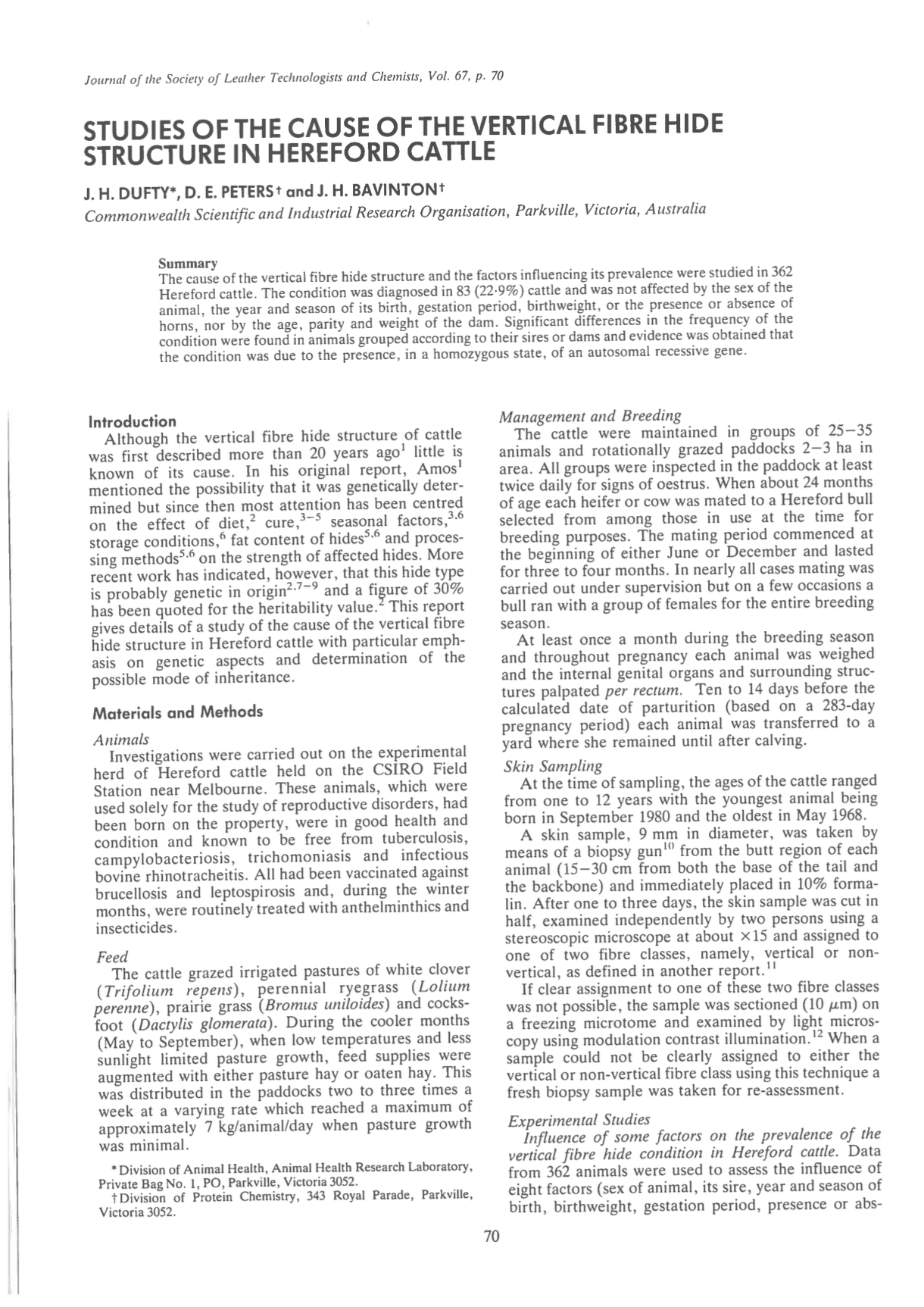 The cause of the vertical fibre hide structure and the factors influencing its prevalence were studied in 362 Hereford cattle. The condition was diagnosed in 83 (22.9%) cattle and was not affected by the sex of the animal, the year and season of its birth, gestation period, birthweight, or the presence or absence of horns, nor by the age, parity and weight of the dam. Significant differences in the frequency of the condition were found in animals grouped according to their sires or dams and evidence was obtained that the condition was due to the presence, in a homozygous state, of an autosomal recessive gene.