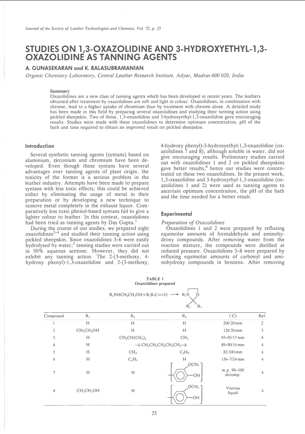 Oxazolidines are a new class of tanning agents which has been developed in recent years. The leathers obtained after treatment by oxazolidines are soft and light in colour. Oxazolidines, in combination with chrome, lead to a higher uptake of chromium than by treatment with chrome alone. A detailed study has been made in this field by preparing several oxazolidines and studying their tanning action using pickled sheepskin. Two of these, 1,3-oxazolidine and 3-hydroxyethyl-1,3-oxazolidine gave encouraging results. Studies were made with these oxazolidines to determine optimum concentration, pH of the bath and time required to obtain an improved result on pickled sheepskin.