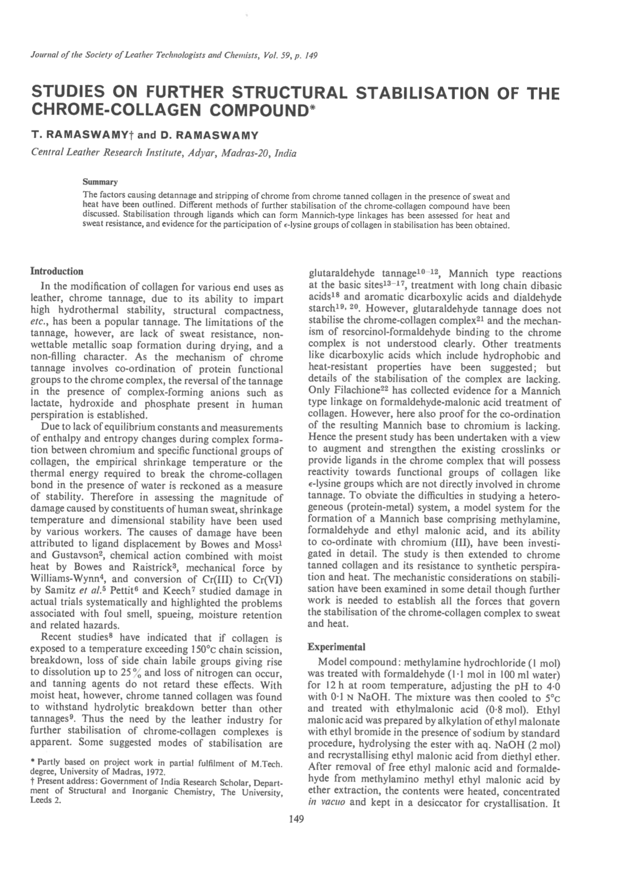 The factors causing detannage and stripping of chrome from chrome tanned collagen in the presence of sweat and heat have been outlined. Different methods of further stabilisation of the chrome-collagen compound have been discussed. Stabilisation through ligands which can form Mannich-type linkages has been assessed for heat and sweat resistance, and evidence for the participation of ϵ-lysine groups of collagen in stabilisation has been obtained.