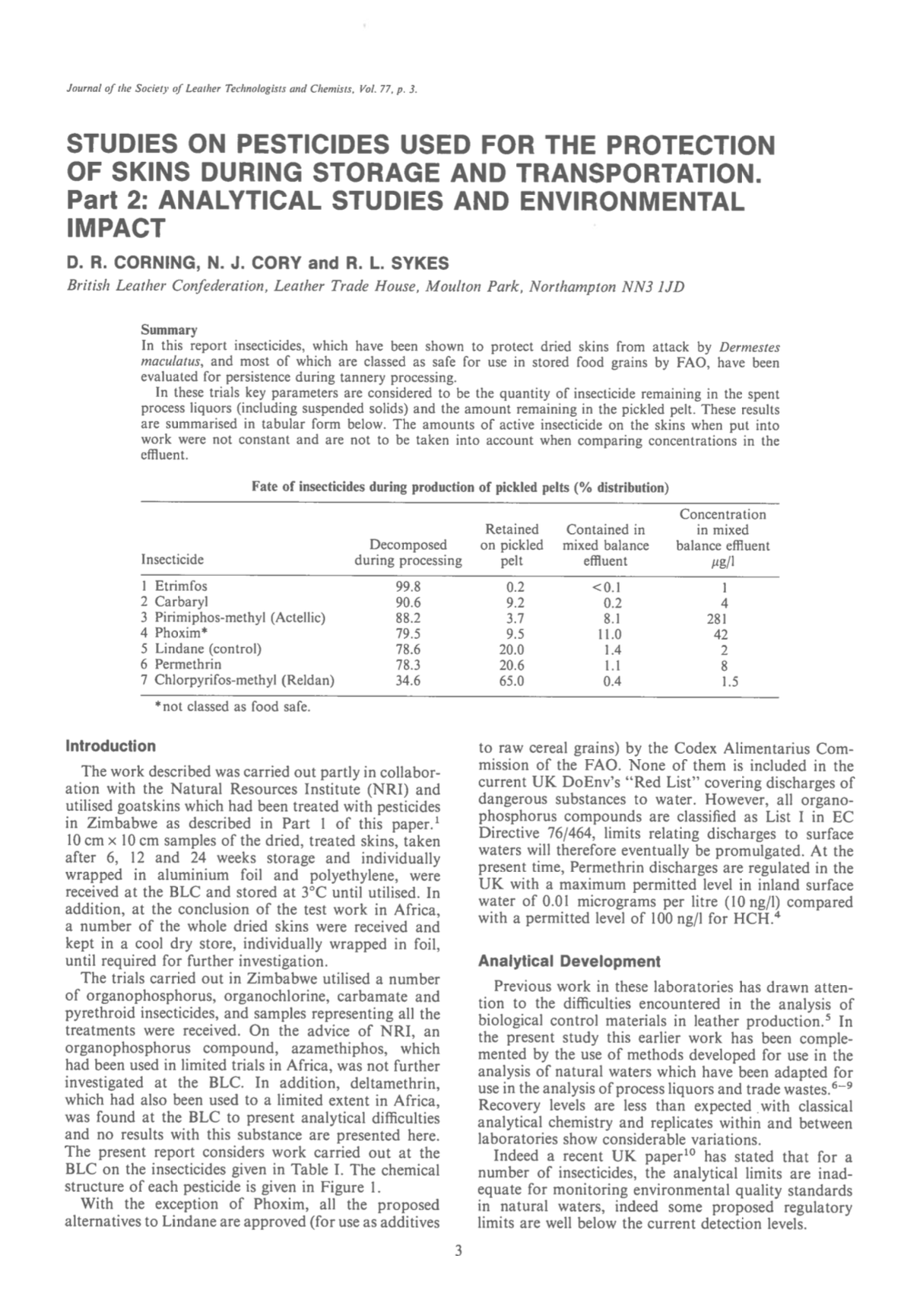 In this report insecticides, which have been shown to protect dried skins from attack by Dermestes maculatus, and most of which are classed as safe for use in stored food grains by FAO, have been evaluated for persistence during tannery processing. In these trials key parameters are considered to be the quantity of insecticide remaining in the spent process liquors (including suspended solids) and the amount remaining in the pickled pelt. These results are summarised in tabular form below. The amounts of active insecticide on the skins when put into work were not constant and are not to be taken into account when comparing concentrations in the effluent.