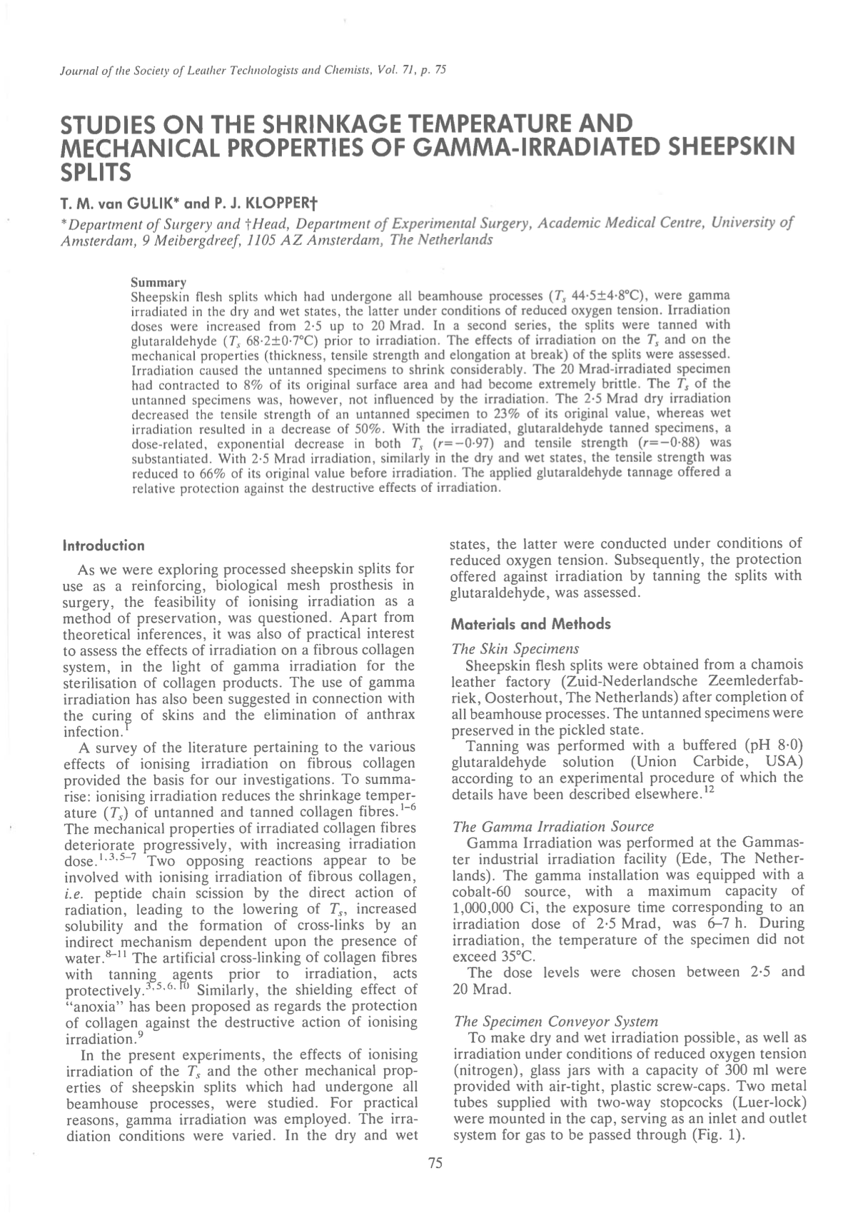 Sheepskin flesh splits which had undergone all beamhouse processes (Ts 44.5±4.8°C), were gamma irradiated in the dry and wet states, the latter under conditions of reduced oxygen tension. Irradiation doses were increased from 2.5 up to 20 Mrad. In a second series, the splits were tanned with glutaraldehyde (Ts 68.2±0.7°C) prior to irradiation. The effects of irradiation on the Ts and on the mechanical properties (thickness, tensile strength and elongation at break) of the splits were assessed. Irradiation caused the untanned specimens to shrink considerably. The 20 Mrad-irradiated specimen had contracted to 8% of its original surface area and had become extremely brittle. The Ts of the untanned specimens was, however, not influenced by the irradiation. The 2.5 Mrad dry irradiation decreased the tensile strength of an untanned specimen to 23% of its original value, whereas wet irradiation resulted in a decrease of 50%. With the irradiated, glutaraldehyde tanned specimens, a dose-related, exponential decrease in both Ts (r = -0.97) and tensile strength (r = -0.88) was substantiated. With 25 Mrad irradiation, similarly in the dry and wet states, the tensile strength was reduced to 66% of its original value before irradiation. The applied glutaraldehyde tannage offered a relative protection against the destructive effects of irradiation.