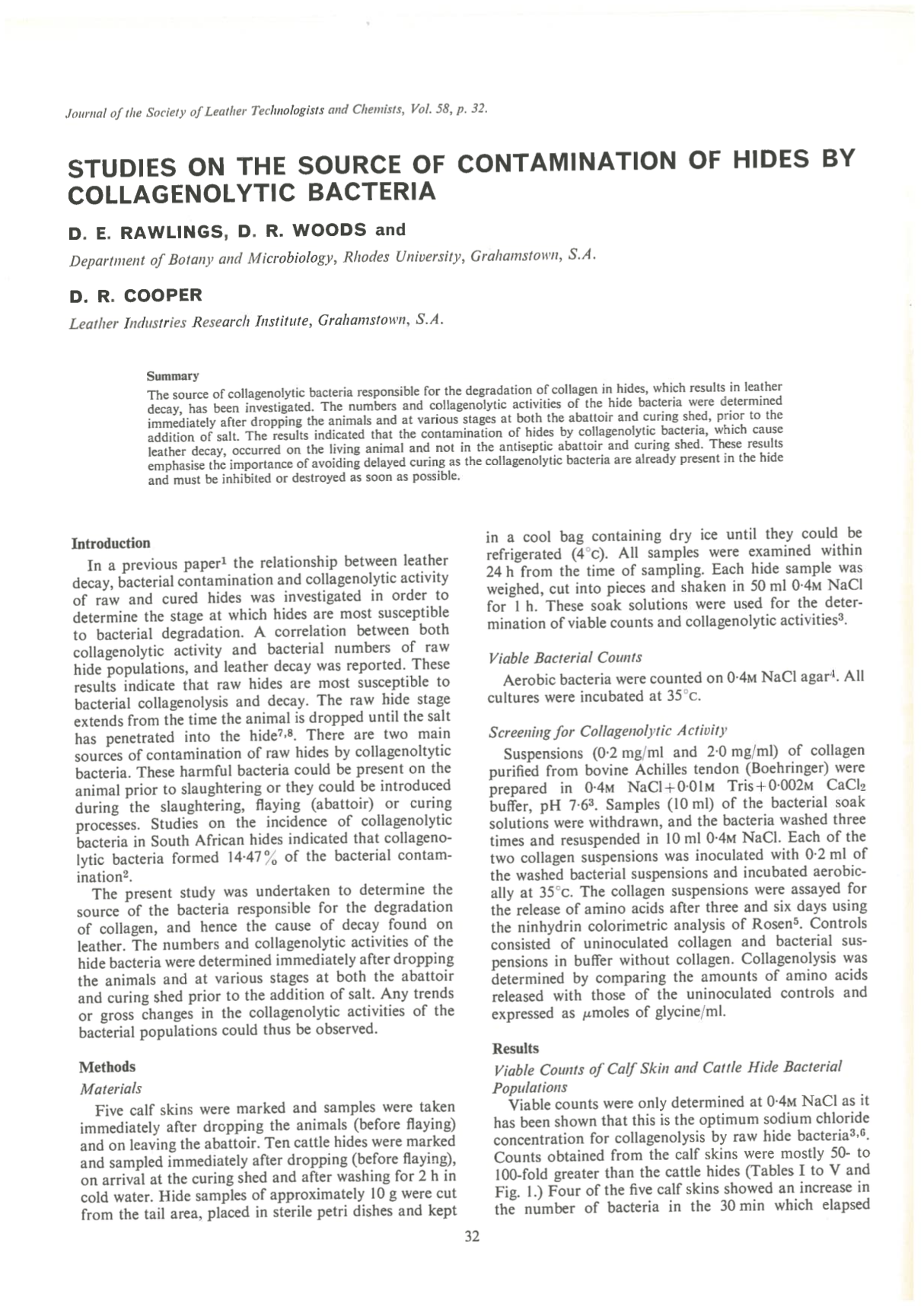 The source of collagenolytic bacteria responsible for the degradation of collagen in hides, which results in leather decay, has been investigated. The numbers and collagenolytic activities of the hide bacteria were determined immediately after dropping the animals and at various stages at both the abattoir and curing shed, prior to the addition of salt. The results indicated that the contamination of hides by collagenolytic bacteria, which cause leather decay, occurred on the living animal and not in the antiseptic abattoir and curing shed. These results emphasise the importance of avoiding delayed curing as the collagenolytic bacteria are already present in the hide and must be inhibited or destroyed as soon as possible.
