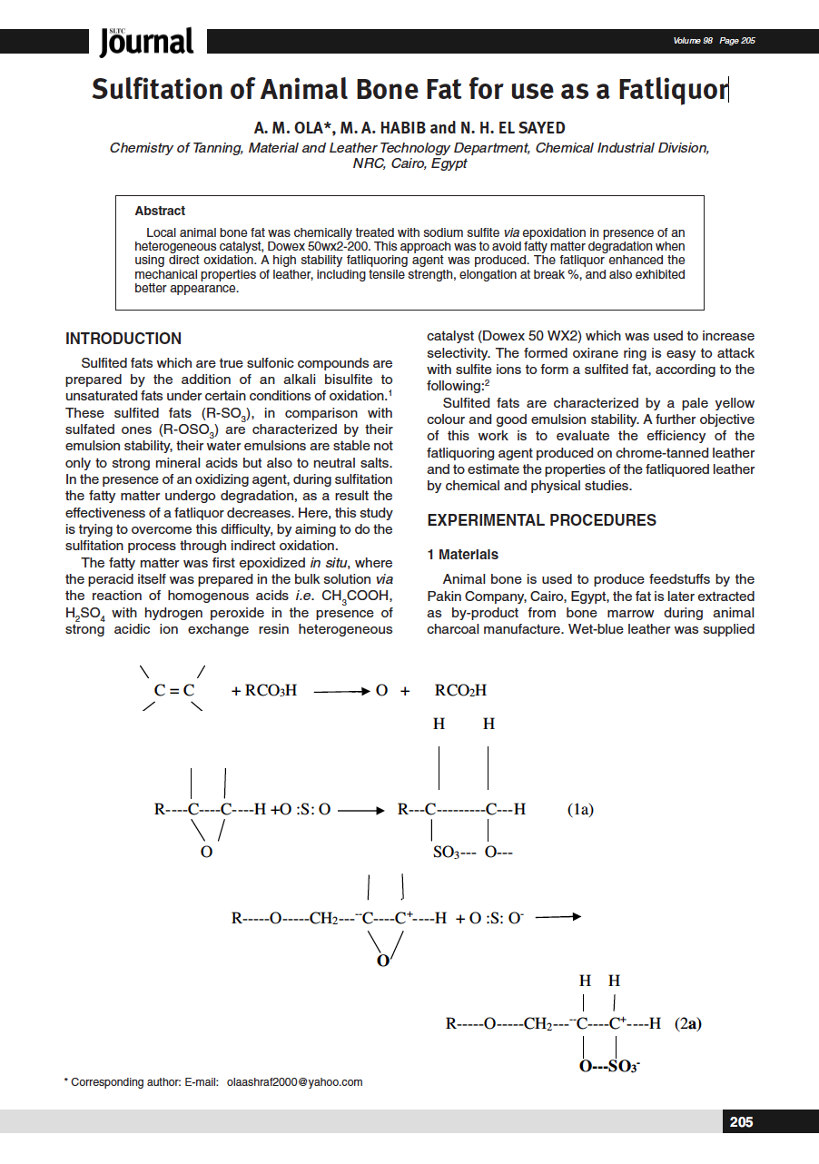 Local animal bone fat was chemically treated with sodium sulfite via epoxidation in presence of an heterogeneous catalyst, Dowex 50wx2-200. This approach was to avoid fatty matter degradation when using direct oxidation. A high stability fatliquoring agent was produced. The fatliquor enhanced the mechanical properties of leather, including tensile strength, elongation at break %, and also exhibited better appearance.