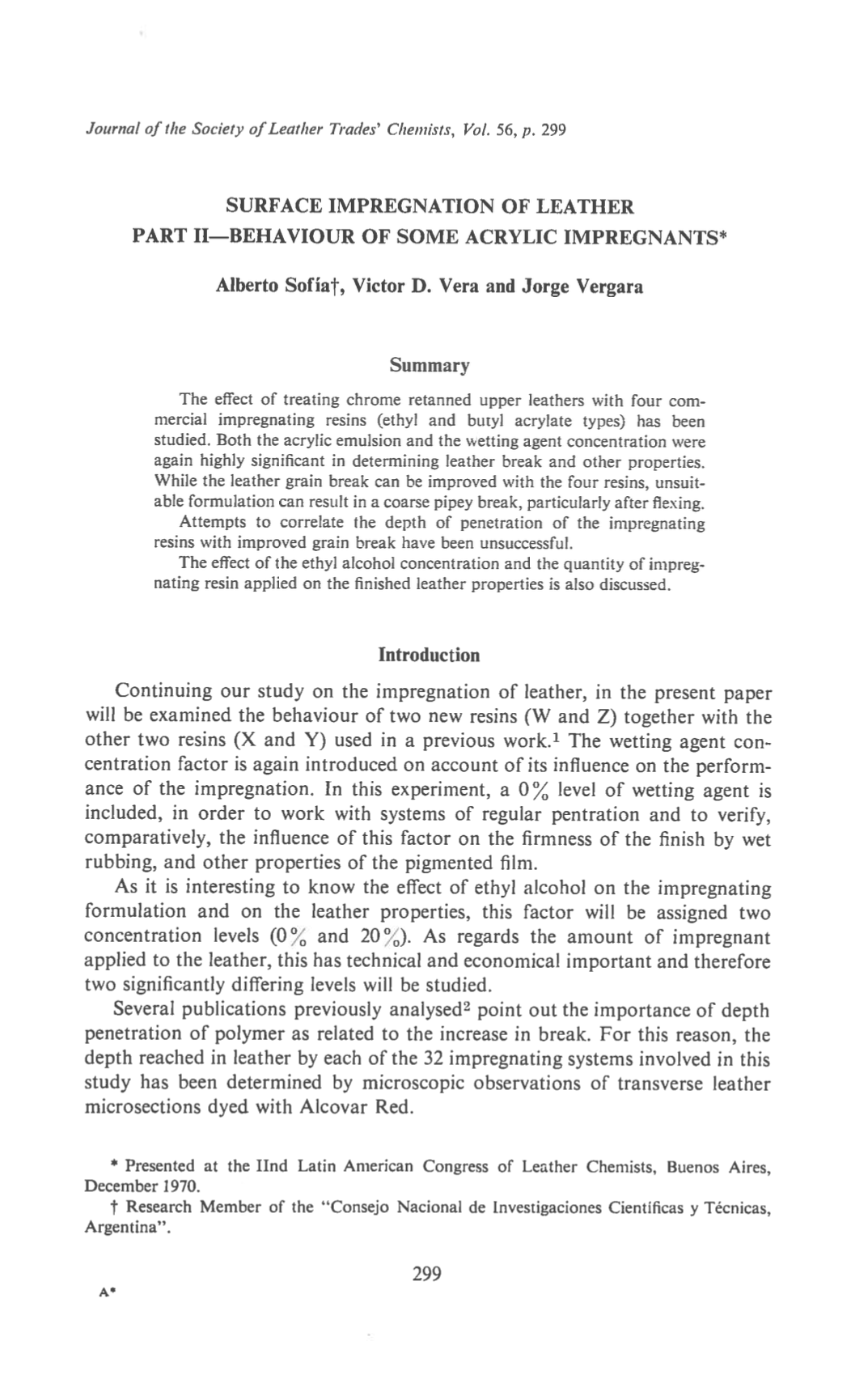 The effect of treating chrome retanned upper leathers with four commercial impregnating resins (ethyl and butyl acrylate types) has been studied. Both the acrylic emulsion and the wetting agent concentration were again highly significant in determining leather break and other properties. While the leather grain break can be improved with the four resins, unsuitable formulation can result in a coarse pipey break, particularly after flexing. Attempts to correlate the depth of penetration of the impregnating resins with improved grain break have been unsuccessful. The effect of the ethyl alcohol concentration and the quantity of impregnating resin applied on the finished leather properties is also discussed.