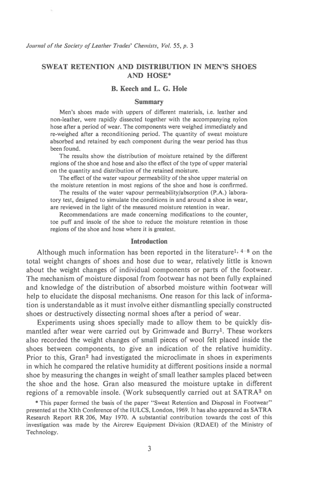 Men’s shoes made with uppers of different materials, i.e. leather and non-leather, were rapidly dissected together with the accompanying nylon hose after a period of wear. The components were weighed immediately and re-weighed after a reconditioning period. The quantity of sweat moisture absorbed and retained by each component during the wear period has thus been found. The results show the distribution of moisture retained by the different regions of the shoe and hose and also the effect of the type of upper material on the quantity and distribution of the retained moisture. The effect of the water vapour permeability of the shoe upper material on the moisture retention in most regions of the shoe and hose is confirmed. The results of the water vapour permeability/absorption (P.A.) laboratory test, designed to simulate the conditions in and around a shoe in wear, are reviewed in the light of the measured moisture retention in wear. Recommendations are made concerning modifications to the counter, toe puff and insole of the shoe to reduce the moisture retention in those regions of the shoe and hose where it is greatest.