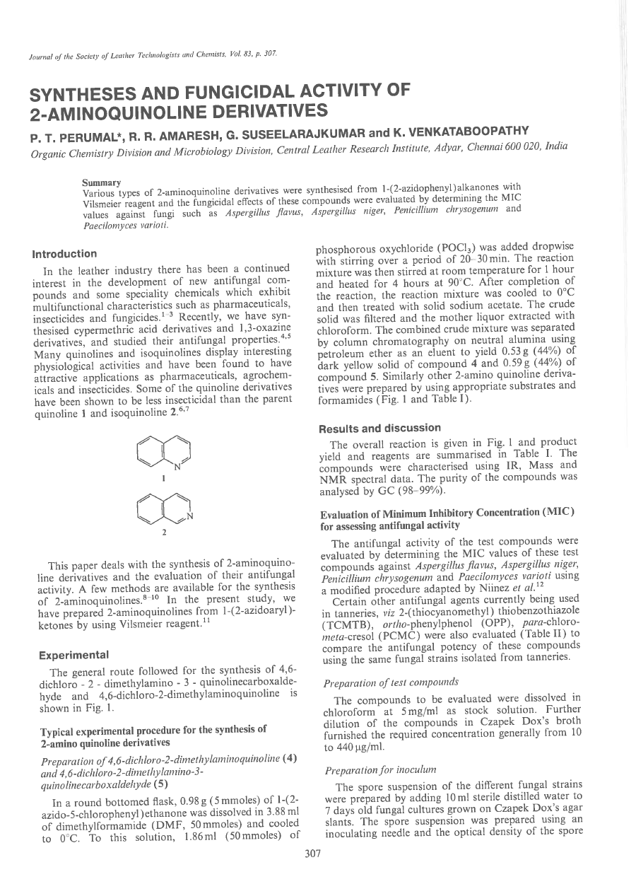 Various types of 2-aminoquinoline derivatives were synthesised from 1-(2-azidophenyl )alkanones with Vilsmeier reagent and the fungicidal effects of these compounds were evaluated by determining the MIC values against fungi such as Aspergillus flavus, Aspergillus niger, Penicillium chrysogenuin and Paeciloinyces varioti.