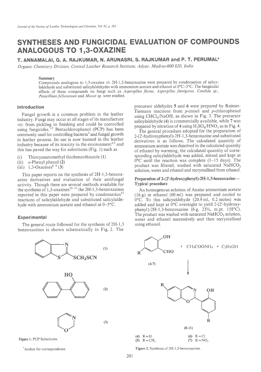 Compounds analogous to 1,3-oxazine viz 2H-l,3-benzoxazine were prepared by condensation of salicy laldehyde and substituted salicylaldehydes with ammonium acetate and ethanol at O°C—5°C. The fungicidal effects of these compounds on fungi such as Aspergillus flavus, Aspergillus fumigatus, Candida sp., Penicilliumfellutamurn and Mucor sp. were studied.