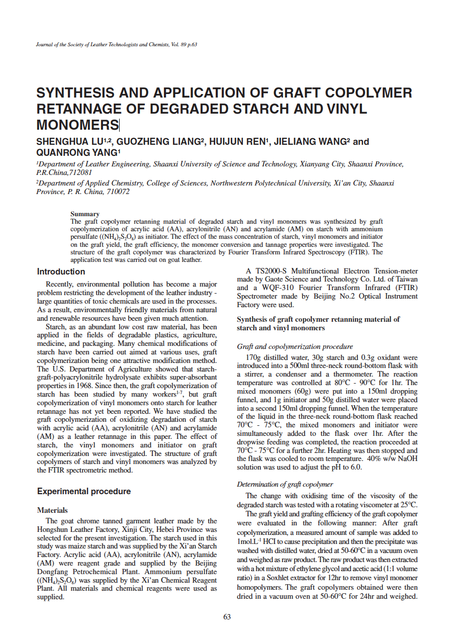 The graft copolymer retanning material of degraded starch and vinyl monomers was synthesized by graft copolymerization of acrylic acid (AA), acrylonitrile (AN) and acrylamide (AM) on starch with ammonium persulfate ((NH4)2S2O8) as initiator. The effect of the mass concentration of starch, vinyl monomers and initiator on the graft yield, the graft efficiency, the monomer conversion and tannage properties were investigated. The structure of the graft copolymer was characterized by Fourier Transform Infrared Spectroscopy (FTIR). The application test was carried out on goat leather.