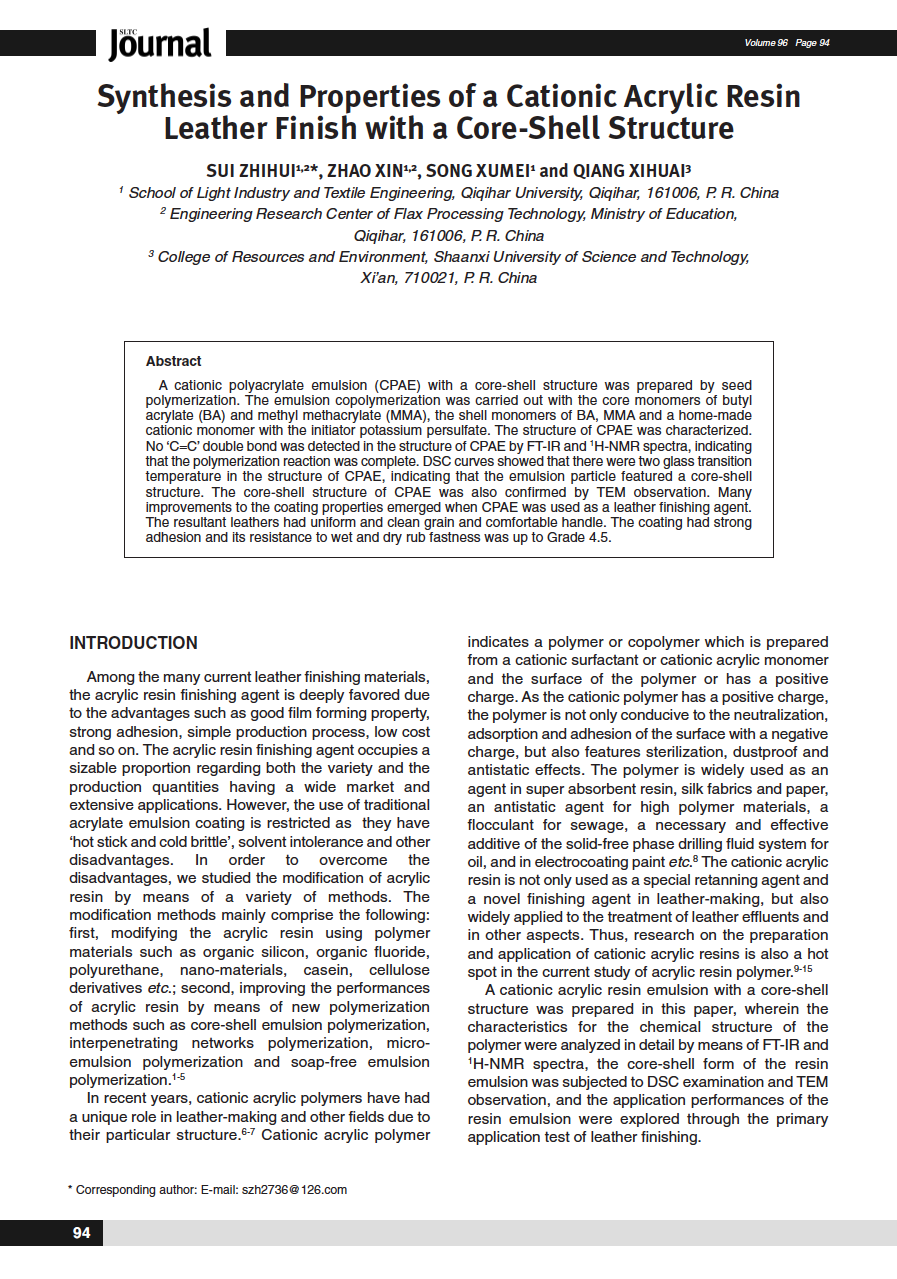 The studies carried out have shown that chitosan possesses high cross-linking properties enabling it to be used for intensifying the process of chrome tanning thus decreasing the consumption of chromium salts and, at the same time, increasing the shrinkage temperature of the leather. IRspectroscopy has shown that interaction between chitosan and collagen is likely to involve oxygen from the C–O–C groups, hydroxyl groups and amine groups of chitosan and the functional groups of collagen, which form bonds of different types. On increasing the consumption of chitosan in treating hides there is rise in the maximum destruction rate temperature for dermal collagen, which was obtained by DTA for chitosan-chromium-tanned leather. The optimum consumption of formic chitosan is 2% of the hide mass at a chromium level of 0.5% of the hide mass calculated as chromium oxide. In this case, the necessary plasto-elastic properties of the leather are provided, and the shrinkage temperature is 92°C.