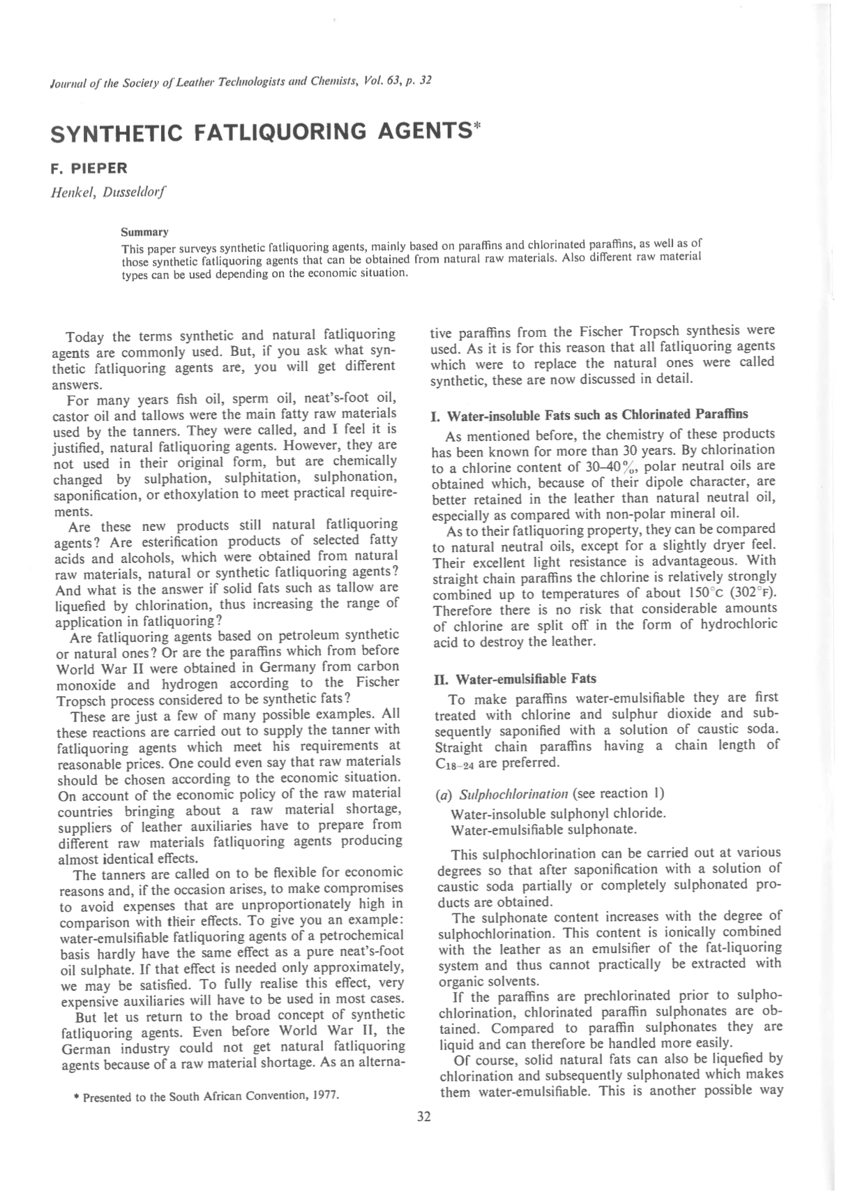 This paper surveys synthetic fatliquoring agents, mainly based on paraffins and chlorinated paraffins, as well as of those synthetic fatliquoring agents that can be obtained from natural raw materials. Also different raw material types can be used depending on the economic situation.