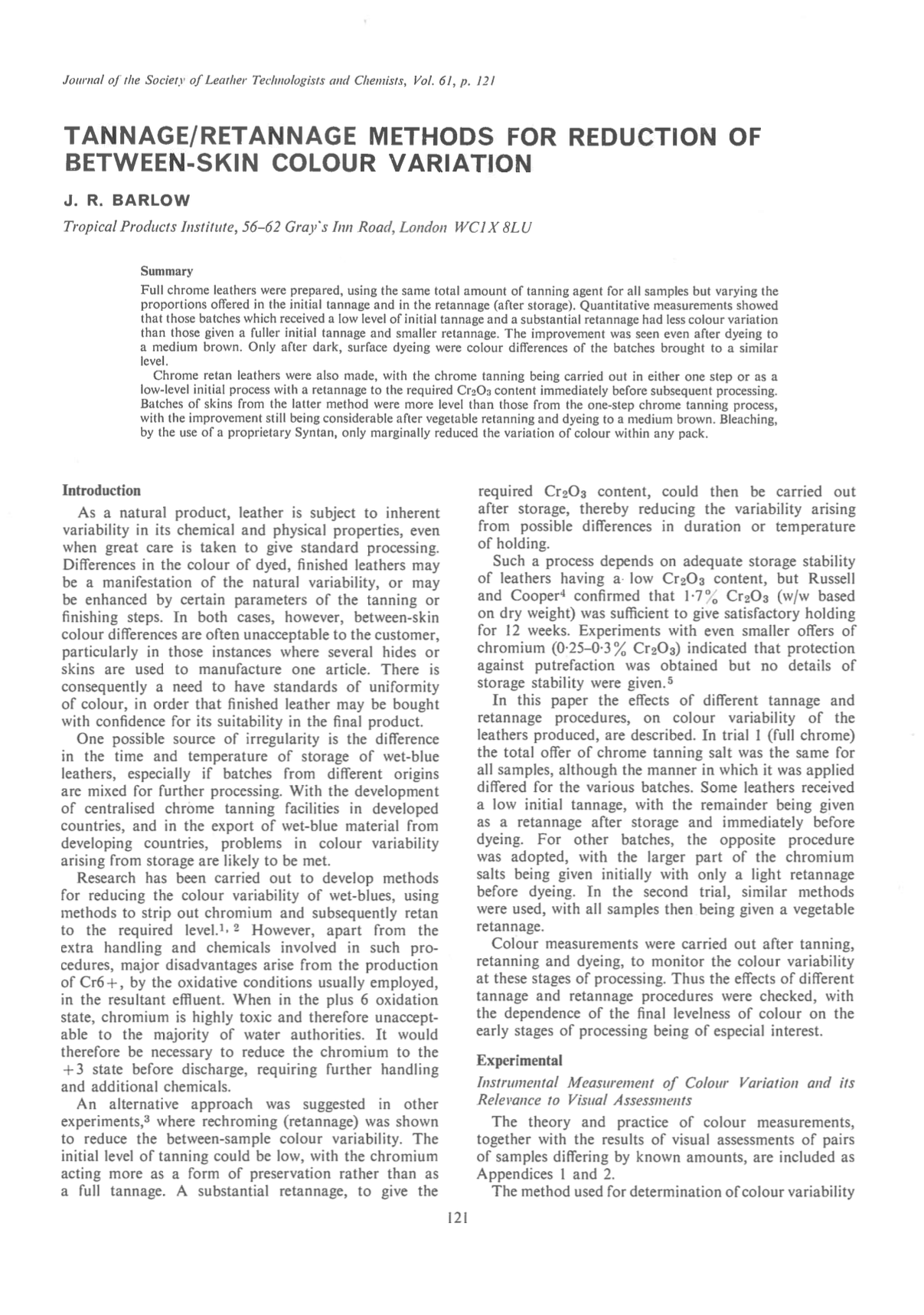 Full chrome leathers were prepared, using the same total amount of tanning agent for all samples but varying the proportions offered in the initial tannage and in the retannage (after storage). Quantitative measurements showed that those batches which received a low level of initial tannage and a substantial retannage had less colour variation than those given a fuller initial tannage and smaller retannage. The improvement was seen even after dyeing to a medium brown. Only after dark, surface dyeing were colour differences of the batches brought to a similar level. Chrome retan leathers were also made, with the chrome tanning being carried out in either one step or as a low-level initial process with a retannage to the required Cr₂O₃ content immediately before subsequent processing. Batches of skins from the latter method were more level than those from the one-step chrome tanning process, with the improvement still being considerable after vegetable retanning and dyeing to a medium brown. Bleaching, by the use of a proprietary Syntan, only marginally reduced the variation of colour within any pack.